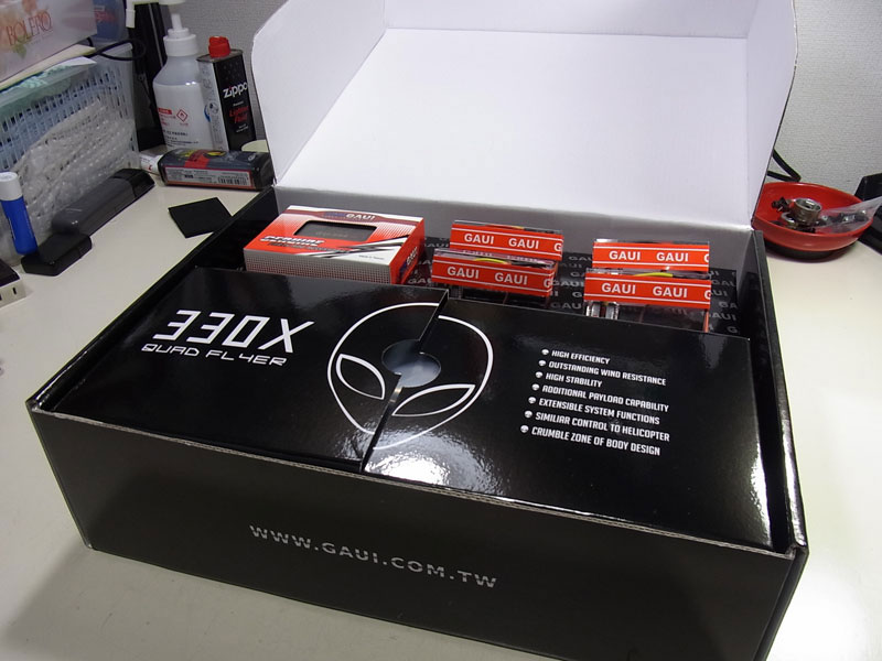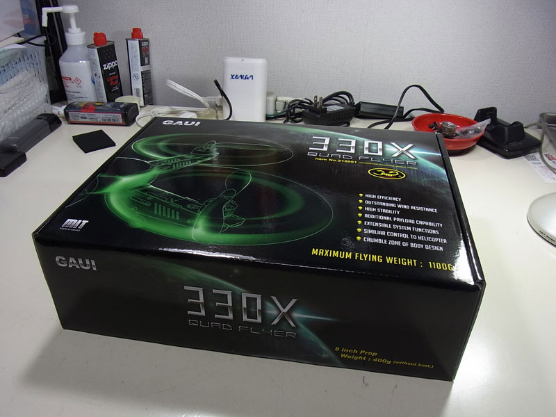 を飛ばすとなると・・・いくら保険をかけているとはいえ、ヘリフライヤーの端くれとして事故のないように努めたいものです。一番安全なのがヘリウムガスのバルーンなんでしょうが、本格的すぎるし操作に難渋しそうなので安定したUAV機をいろいろと物色。ちまたで噂のAR Droneも考えましたがやっぱりラジコンじゃないとね(笑) ・・・ということでGAUIのQuadFlyer、330X-Sを導入しました。最初に買う電動ヘリ?がQuadFlyerとはねぇ・・・。大丈夫かな・・・。
