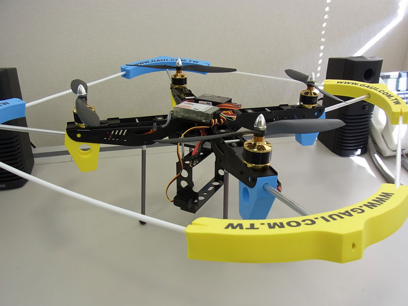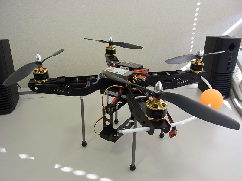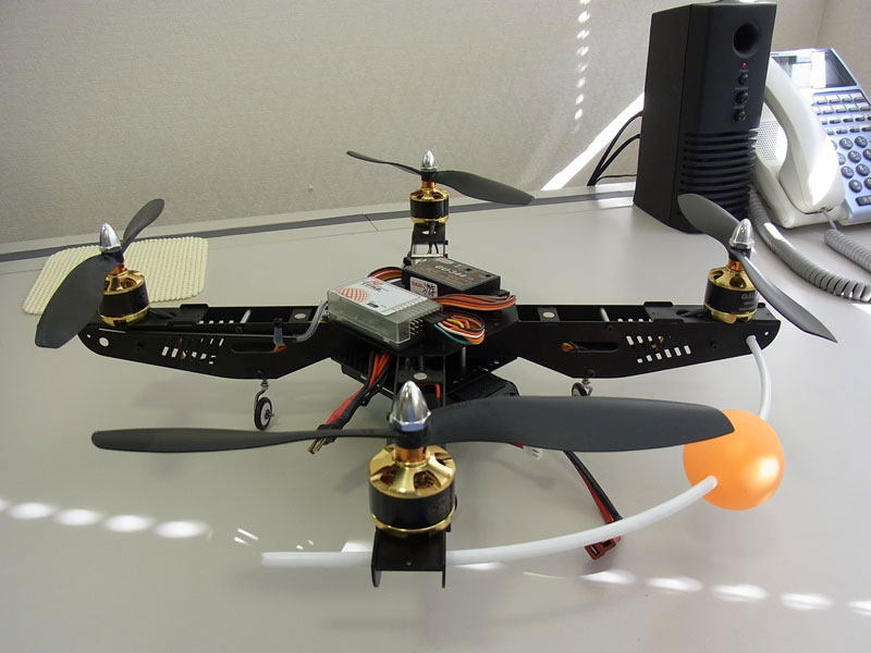 パッケージ自体は小さいのですが、中は結構しっかりした梱包。おもちゃという感じじゃないですね。サーボがない代わりにアンプとモーターは4つもあります・・・。 組み立て自体は2〜3時間で完了するくらいあっさりしたものですが問題はその後。果たして上手く設定できるかどうか・・・。マニュアルと悪戦苦闘すること3時間、なんとかアンプの設定(といっても初期化しただけですけど)も完了。途中、スロットルサーボのリバース設定を間違えてしまい、あわや大惨事になるシーンもありましたが何とか切り抜けました(^^;; GPと違っていきなりペラがブン回るのでかなり怖いです・・・。 さすがに自宅ではホバリングすらさせられないのであとは職場で調整することに。カメラジンバルやソフトガードも取り付けました。結構大きくなりますがいきなりペラが当たることは避けられそうです。CX3を積んでちょっと会議室を撮影。