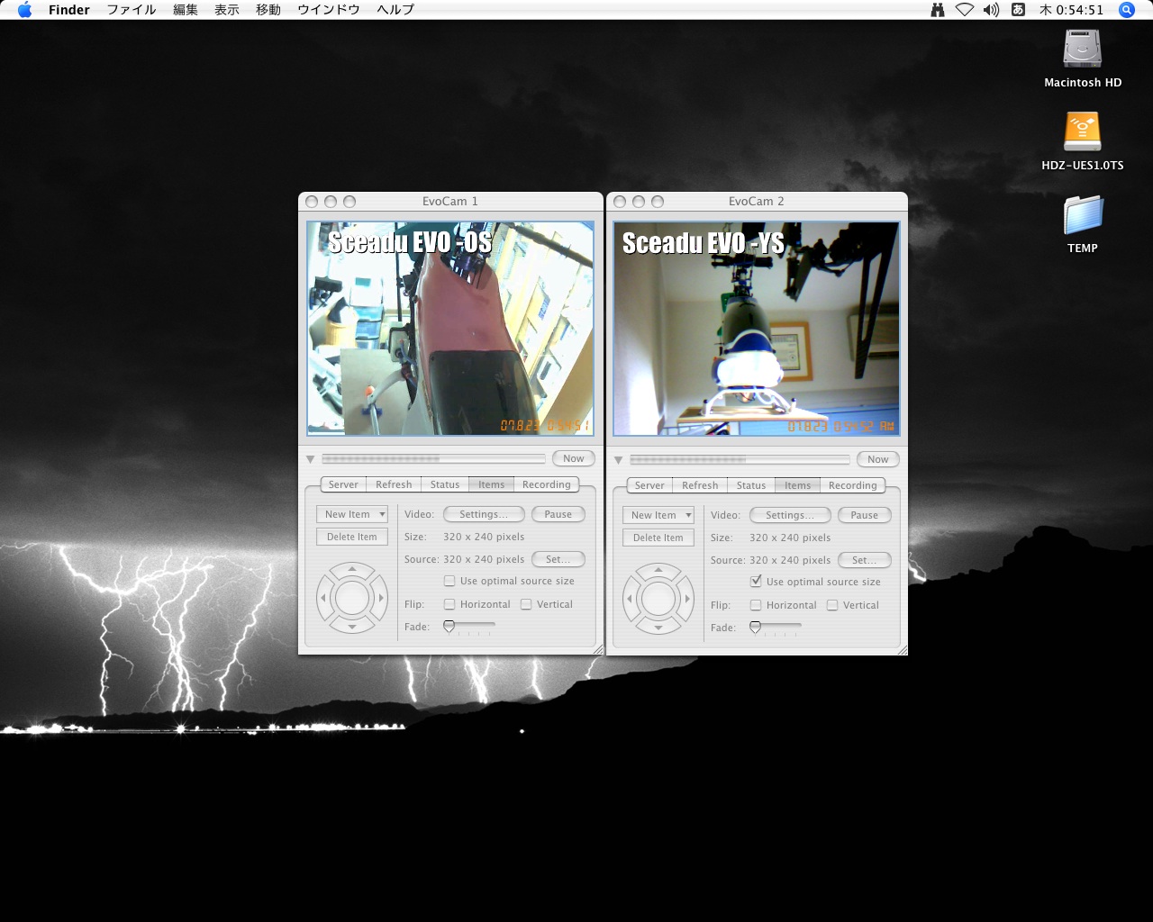今回の目玉です(笑) OSスカディーを撮影しているのはLOASのPCカメラ、MCM-H06SLです。撮影素子はCMOSで画素数は35万画素とたいしたことはありませんが、赤外線LEDを内蔵しているので真っ暗闇でも撮影できる優れものです。ドライバはWindows用しかありませんので、オープンソースで開発されているMac用ドライバであるMacamをインストールして使っています。調整範囲は限られますが十分使用に耐えるドライバです。また、YSスカディーを撮影しているのはエレコム製のUCAM-DLM130Hです。このUSBカメラは比較的新しく、UVCに対応しているためドライバが不要です。WindowsXP/Vistaならドライバなしで、またMacOSXでも10.4.9以降なら標準でサポートしているので便利です。このカメラはCMOS130万画素なので比較的高解像度といえますが、画質的にはCCDに負けてます(^^;; あと、暗所にはめっぽう弱く部屋が暗くなると何も写りません(笑)