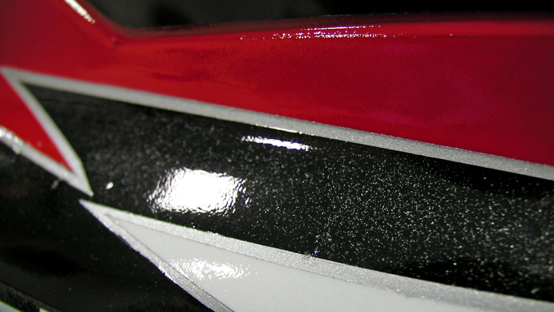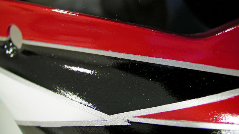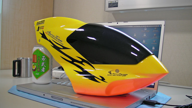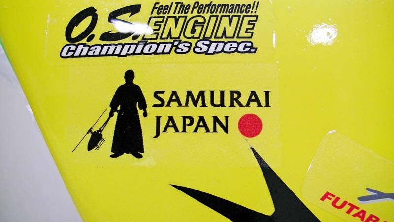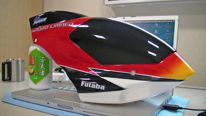 ウレタンクリアを吹く前に、各種デカールを貼り付け。FutabaやOS、HIROBOなど貼ってみましたが、なかなか【これだ!】と思えるデザインに乏しいのが現実。自分で作ってもいいのかも知れませんが、白塗りの文字は通常のインクジェットプリンタでは困難です・・・。熱転写方式のMD5500やカッティングプロッタなどで作ってみるのも面白そうですが、年に1度あるかないかのイベントでそこまでコストをかけるに値するかどうか微妙なところ