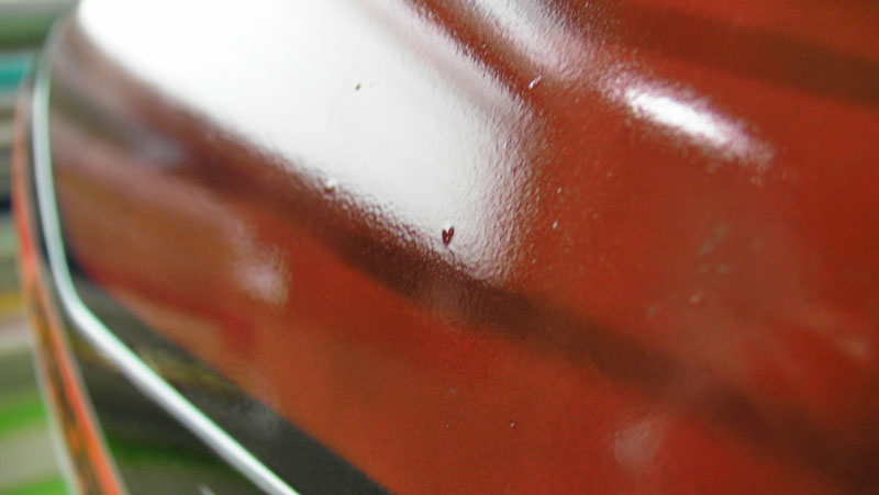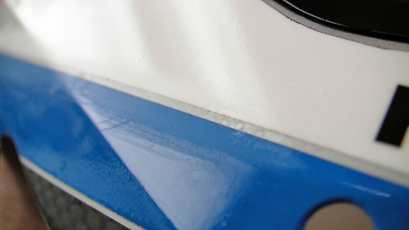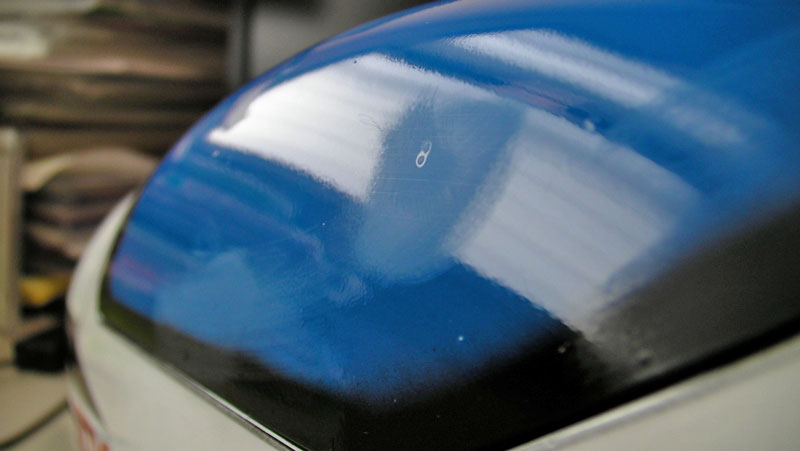 小さなホコリなどが付着するため、メチャクチャきれいとは言えませんがまずまずの出来。あとは乾燥を待ってサンドペーパーやコンパウンドで軽く研ぎ出せば完成です。下の写真にあるように、ホコリを核とした毛羽立ち?ができると機体清掃時にウェスの繊維が引っかかったりするのでとりあえずこうした毛羽立ち部分だけ研ぎ出します。コンパウンドは完全硬化を待ってからになるので今週中にはできるかな?