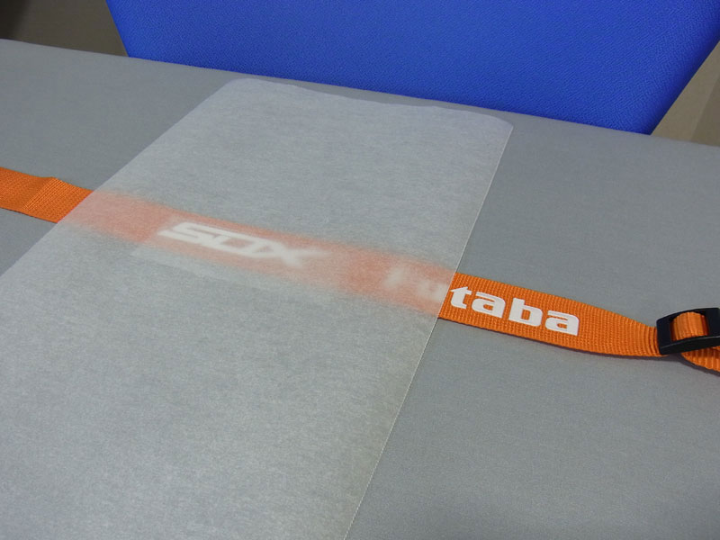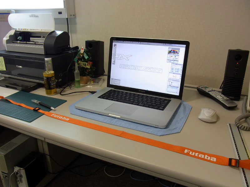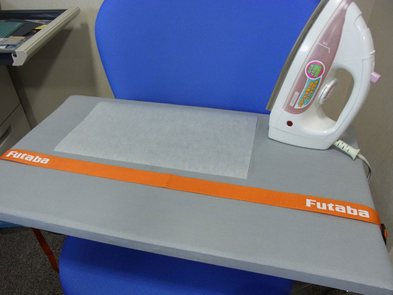 続いてはアイロンシート。伸展性のある樹脂シートですが、アイロンで接着することができます。ヤフブロで有名なお金持ちのSHOさんのアイデアをパクってます(^^;; SHOさん同様プロポ用のフックバンドに貼り付けてみました。Futabaのロゴはエンボスっぽく接着されているのですが、隣に貼り付けてもあまり違和感がありません。結構いい感じかも