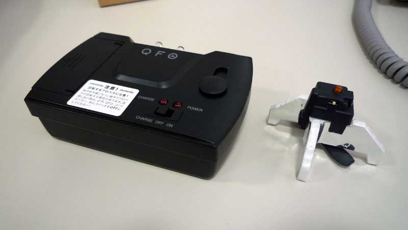 IRコントローラーはアルカリ単3電池6本が必要で、実際に入れてみると結構重く感じます。大きさはニンテンドーDSを少し厚くした感じでしょうか。操作はエンコンのみ。スライドタイプのスロットルが右側に一つ付いています。左側には充電用のケーブルが格納されていてQFO本体と接続し約10回程度の充電 ができるようになっています。コントローラーとQFO本体。飛ばさなければUFOには見えません。