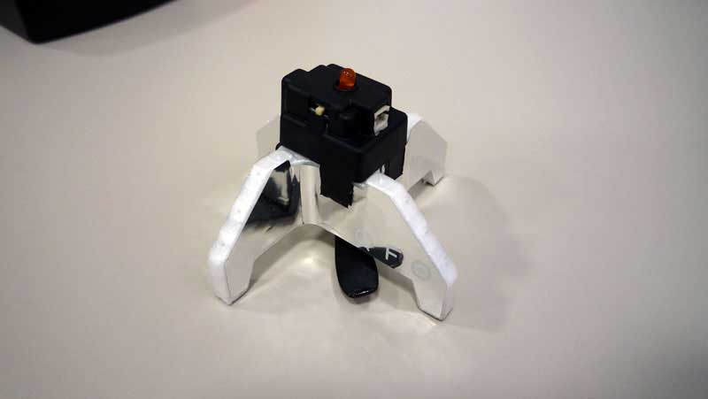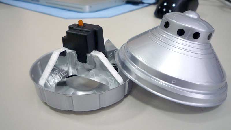 QFO本体ですが、重量わずか9g。パッと見た限りでは『これで本当に飛ぶの?』というほど頼りない感じです。本体を支えるフレームは発泡スチロール製、真ん中に上昇用のファンとIR受光部、てっぺんにはLEDが付いていて飛行時に点滅するようになっています。実際に飛ばしてみると・・・