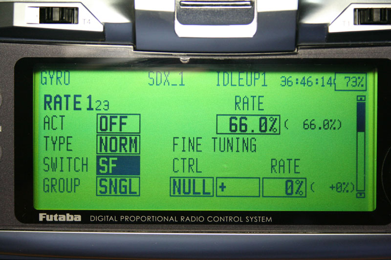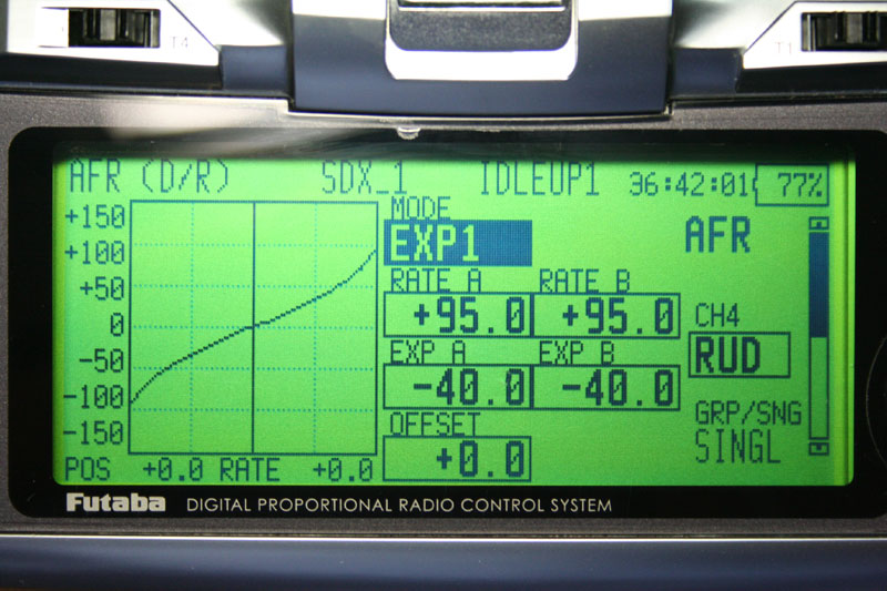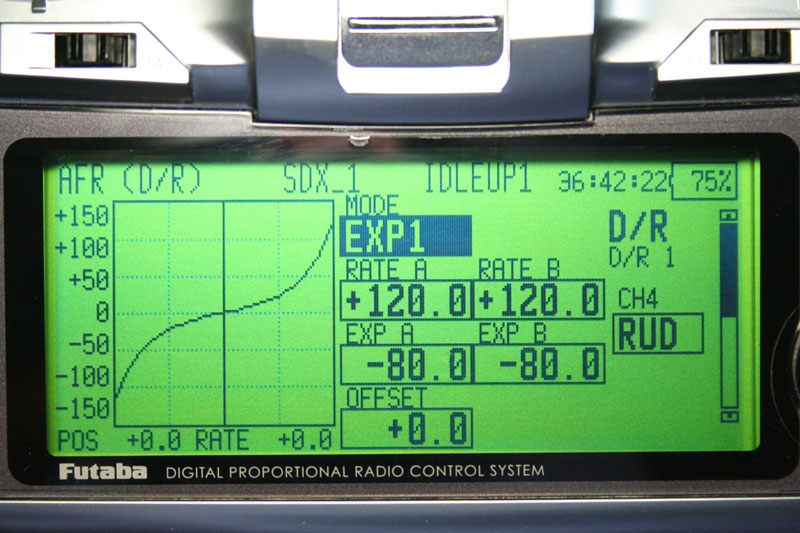 かも知れませんがRATEは±120、EXPは80ほど入れています。お気づきかも知れませんが、D/R状態になったことはバッテリマーク下の表示を見てもわかります。あとはスイッチの切り替えで画面が切り替わるか確認。うまくいったら設定終了です。玄人さんが見たら何じゃこりゃ?の設定。D/R状態であることもわかります。
