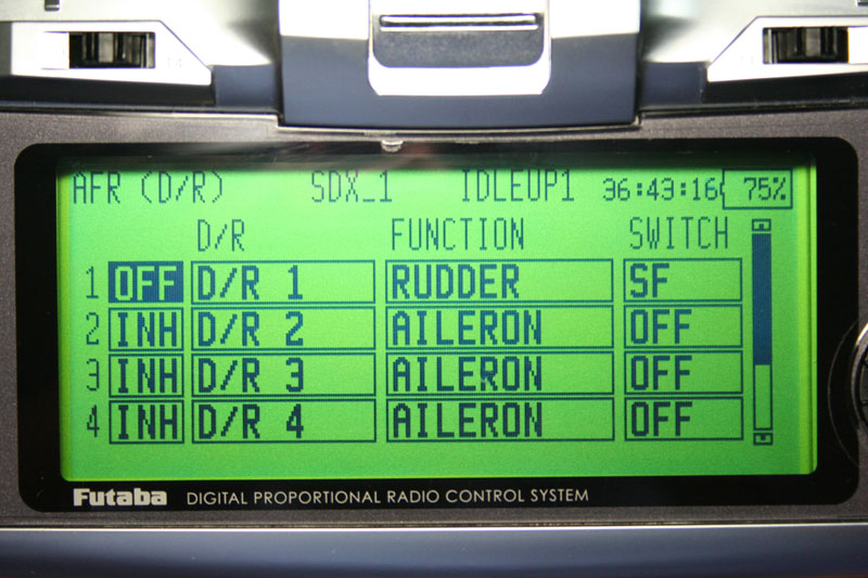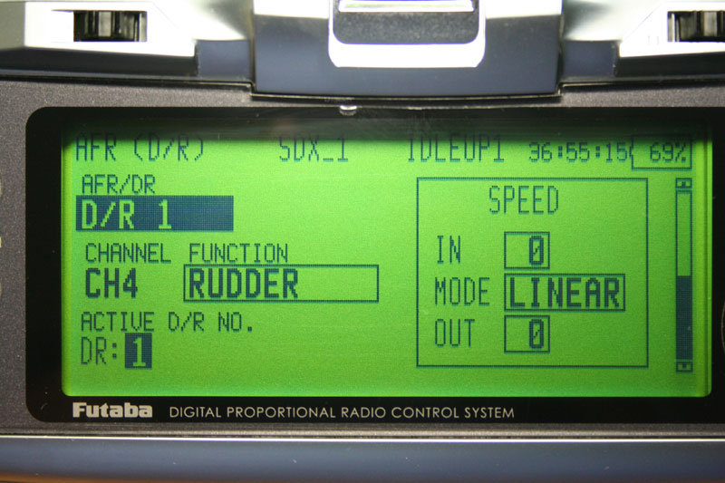 さて、ここで先ほどの画面に戻りスイッチFを手前に倒します。すると【AFR/DR】の項目部分が【D/R 1】に切り替わりました。やったね!