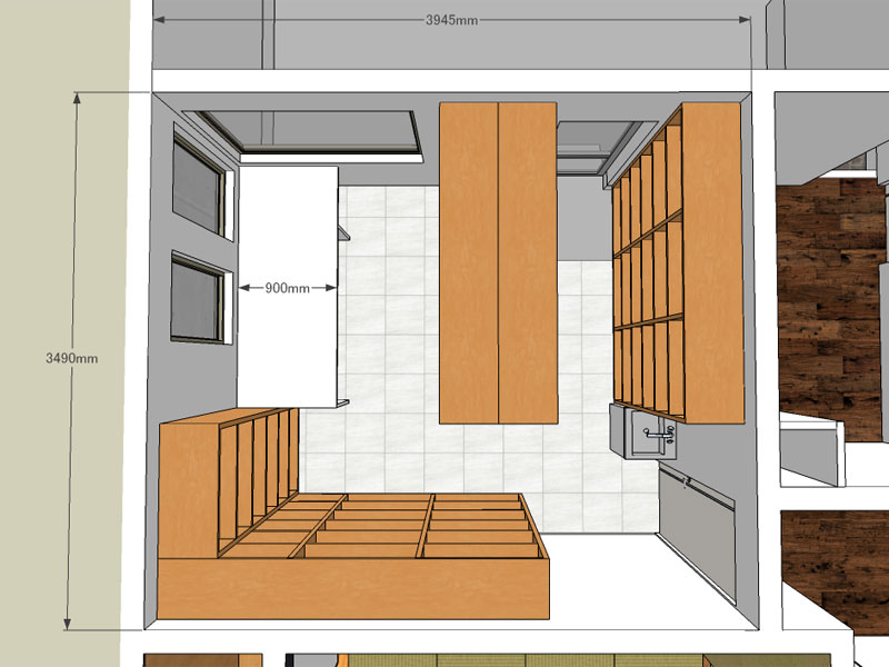 【作業台は、診察処置室の机か作業台のような感じでも良いかと思います。材質は、木、集成材、メラミン化粧板、人造大理石、タイル貼、ステンレス等々。奥行きは窓の開閉を考えると90cm以下(45〜60cm程度)、長さは(将来90ヘリ導入も視野に入れると?)棚下まで延ばして小さな流司を埋込み。その下に晩酌用の冷蔵庫。台下には引き出しを付けて道具類を収納。PC、LAN関連設備、コンセント多数。】