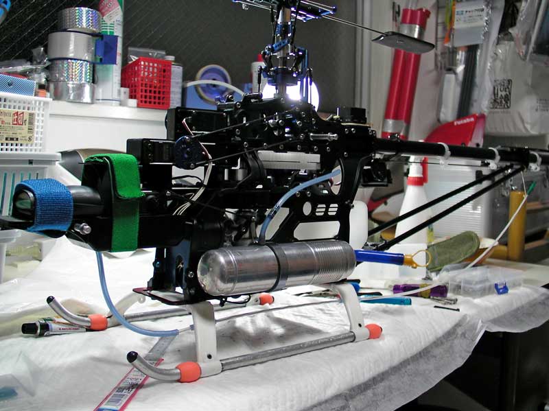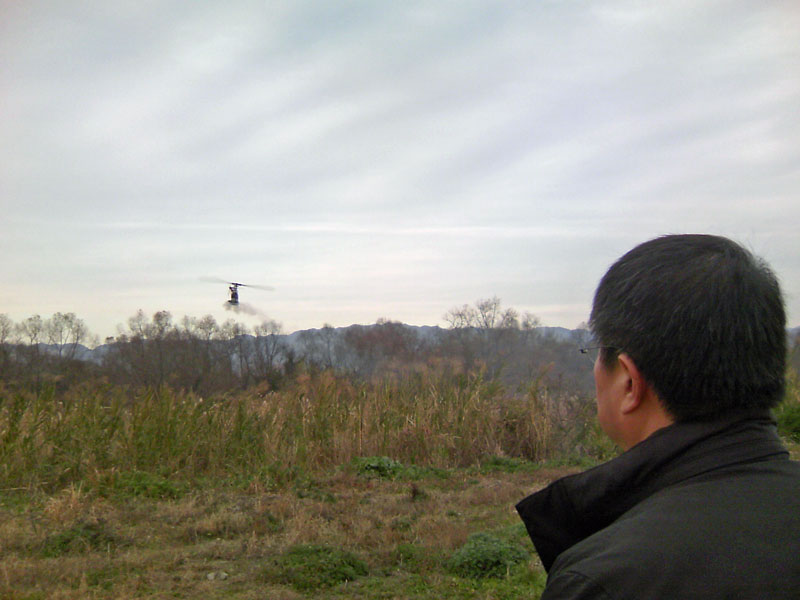 飛行場にはスカディで3DをされているEさんの姿だけが。ちょうど到着されて間もない頃らしく準備されていました。今日はエンジンの調子その他を見に来て いるとの由。エンジンはOS、スワッシュはタービュランスのものです。上空をブンブン振り回されていましたが、ちょっと過回転気味。ニードル調整やスロッ トルカーブ、ピッチカーブをいじられ何度か調整されました。Eさんはかなり遠方までスカディーを遣るのですが、もう機体姿勢がほとんどわかりません