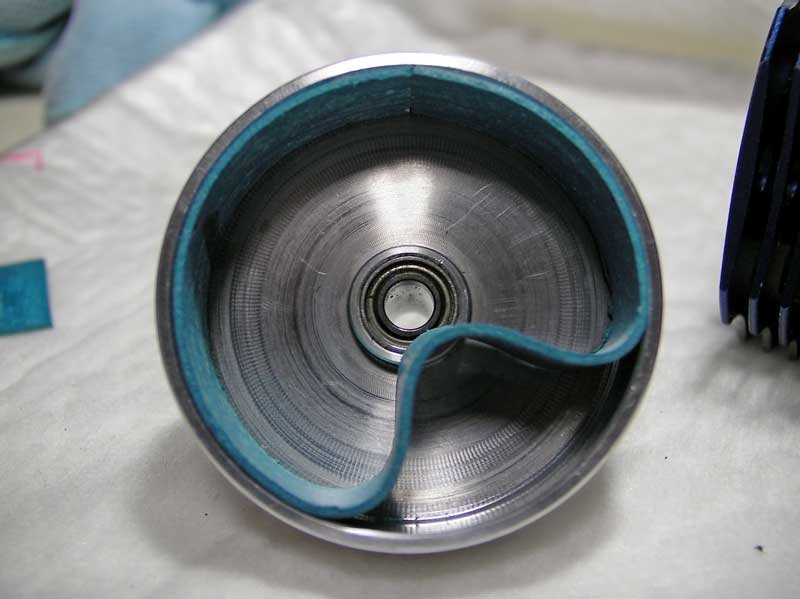 帰り道I店主の元へ立ち寄り、昨日失敗したライニングと念のためクラッチシューも購入。家に帰って整備です。バラし終わっているので、後は組み立てるだけですが昨日の失敗をしないように仮組みは最小限にとどめます。ライニングは少し余るくらいがいいので長さを約 1mm位長めに切り取り、端端を合わせてからベルに押し込みます。長さがオッケーならエポキシを塗り一気に押し込めば大丈夫です。エポキシは長時間硬化型(30分以上)がメーカー推奨らしいのですが、とりあえず10分硬化型で接着。まぁ、大丈夫でしょう(笑)