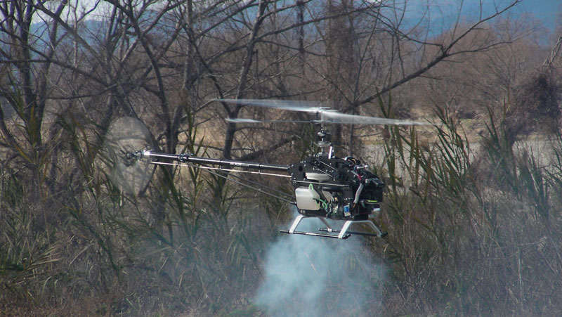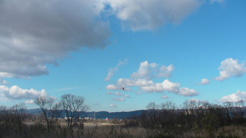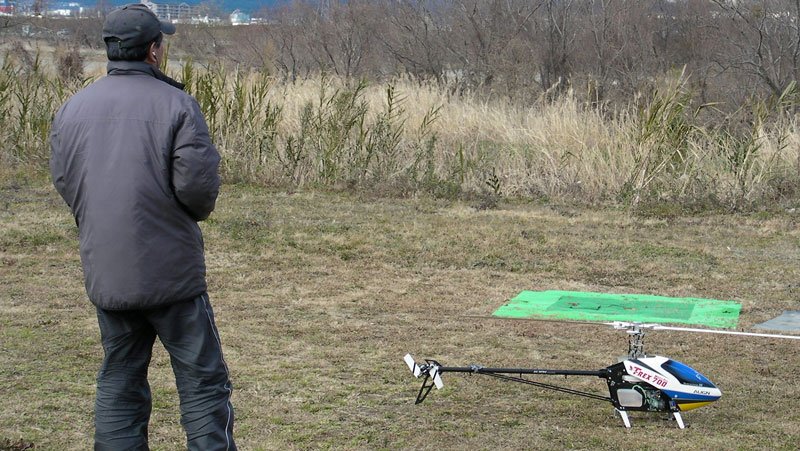 。こんな時に限って上司から【早く帰ってよし】と号令が(笑) いいお天気ですからだれかいるでしょうとのことで偵察に出かけました。僕が到着したとき、飛行場にはJYALAさん、hatayanさん、Y2さんのお三方が。ちょうどJYALAさんがT-REX450を飛ばしていた時でした。