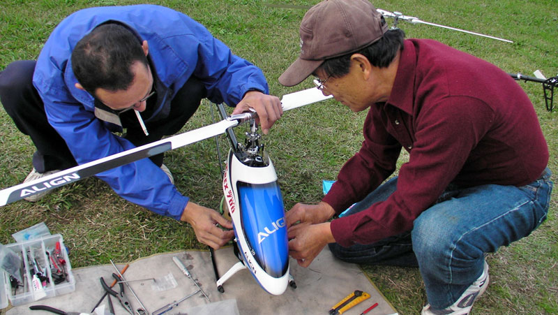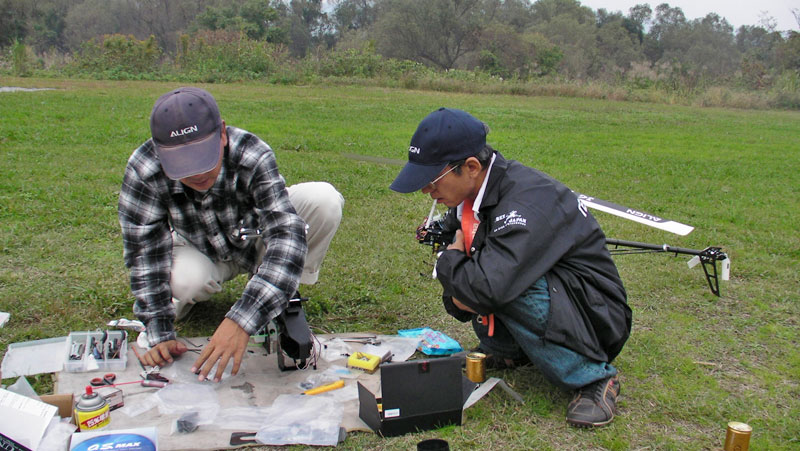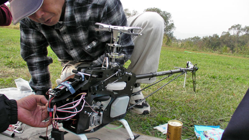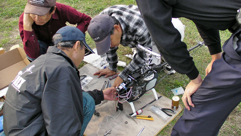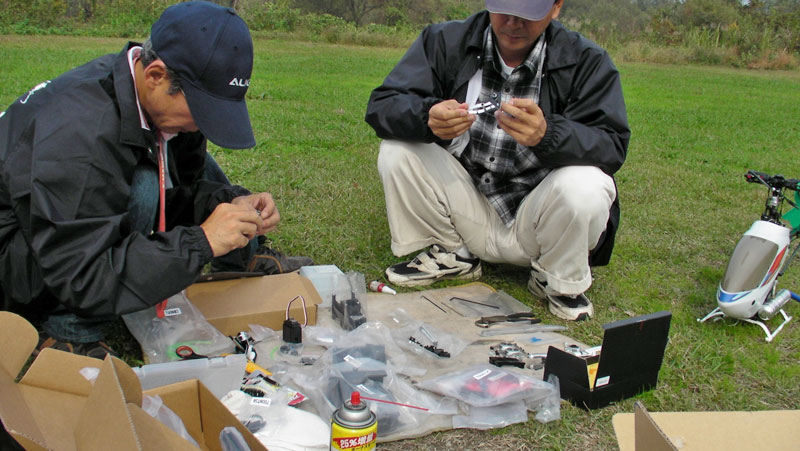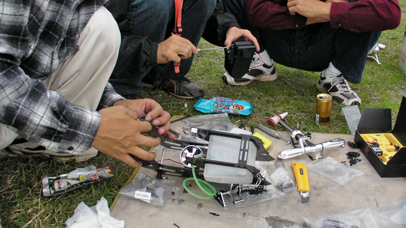 なんせ今回は機体の組み立てはもちろん、メカすら全くのサラ状態。Uさんが説明書を忘れてきたこともあり、組み立ては脳内記憶+現物合わせ。恐るべき集中力でした。3Gの設定はK2さんがあれよあれよという間に終え、フレームのマシ締めなどコツが必要な部分はJYALAさんがトータルでサポート。一人でやっていたらおそらく2〜3日はかかるであろう作業内容だったと思います。