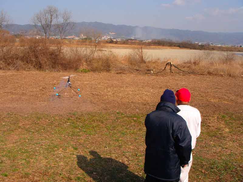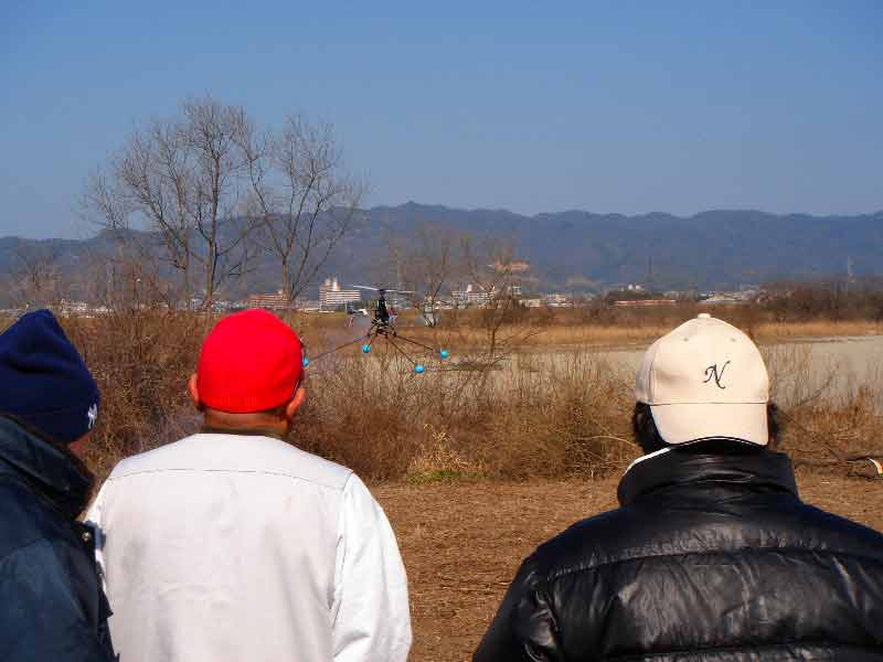 風速計で風速を測ってみると常時2-3m/sec、時に7m/sec程度の風が吹きます。外乱要素が大きいので機体を安定させるにもけっこう神経を使います。今日はホバリング練習中の二人が来られていたので店主さんはその二人の指導に当たっていました。