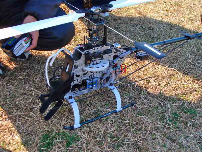 強風かつ堤防整備のため飛行機を飛ばすコンディションにないようでTさんはフライトされることはありませんでしたが、Iさんはヘリを持ってこられていました。いつものBravoかと思いきや、なんと当飛行場では初めて目にする電動機です。おニューのT-REX600のバッテリ充電中でした。スカディー片手に挨拶すると「まだ環境に悪そうなエンジン機飛ばしてんの〜」と冗談がてら言われてしまいました(^^;;