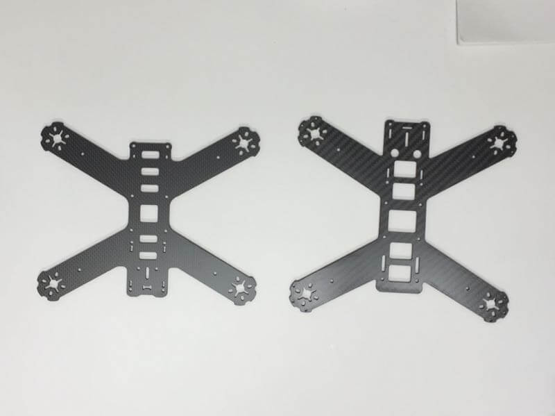 さて、ここからが本題。210クラスと180クラス。違うのは軸間のはず。クアッドのクラス分けなんてそうだと思っていました。しかし、届いた2つのフレームを並べてみると…。並べても重ねても、210(左)より180(右)のほうが大きく見えます。