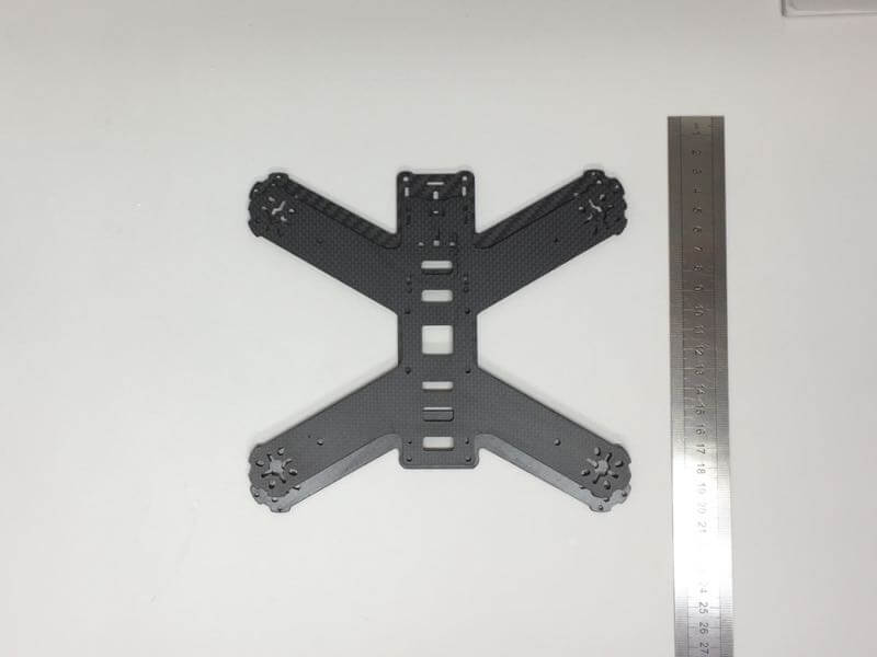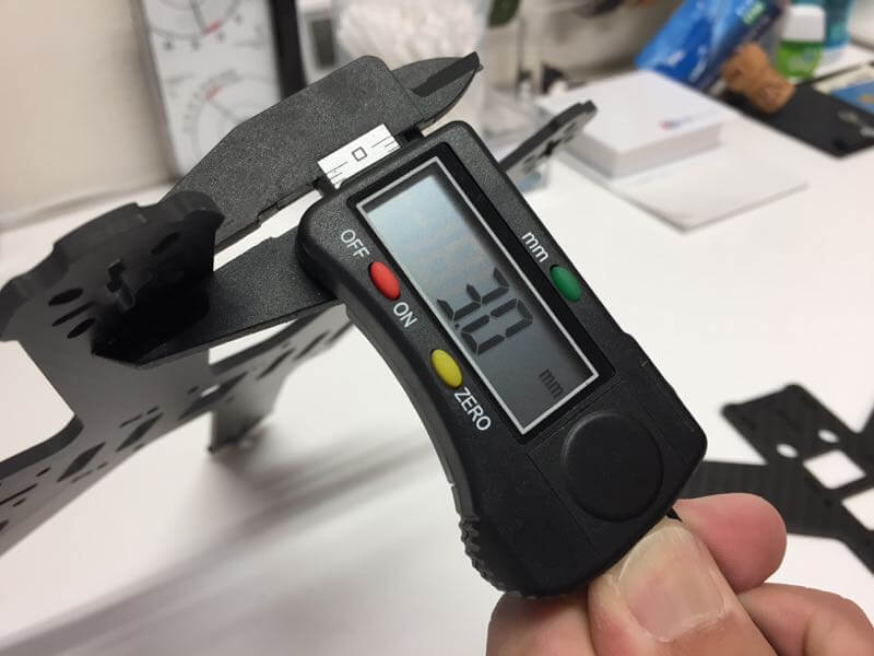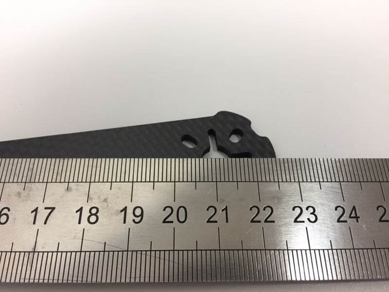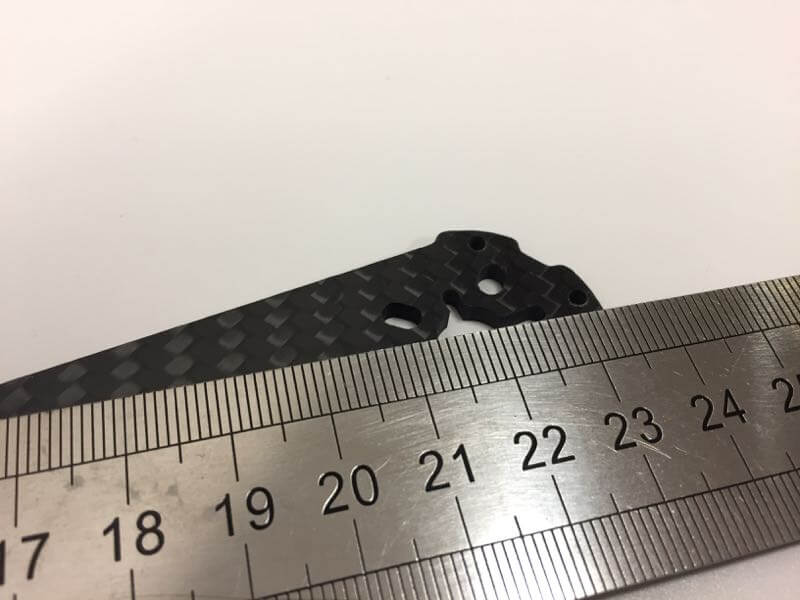 どうみても180として届いたほうが大きく見えます。計測してみると、180クラスとして届いたフレームは軸間が220mm程度、210として発注したフレームは軸間210mm程度でした。180キットなのにフレームが220mmとは…。 180クラスの軸間220mm弱、210クラスの軸間は210mmでした。