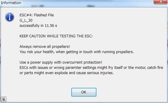 上手く繋がったらESCに電源をつなぎ、BLHeliSuiteから"FlashBLHeli"を選ぶだけです。上手く通信できていたら今現在のESCの状況が表示され、続いて書き換えるFWが表示されます。EMax12Aの場合はXP12AというFWを選ぶことになっているようなので、これを選択し書き換えます。無事書き換えが終われば、はれてBLHeliのESCの完成です。ただし、ブートローダーはそのまま(Nfets/Pfetsを外すと可能らしい)なので書き換える際は同じ手順を踏まないといけないのが面倒です(^^;;
