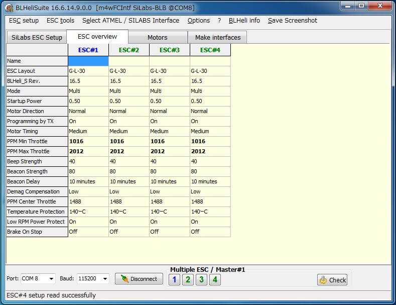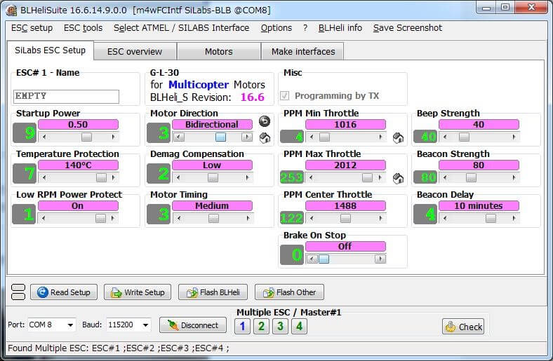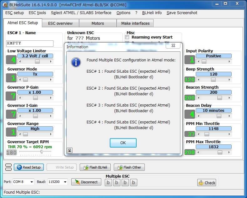 ESCは使っているCPUとFWで性能が大きく変わってきますが、基本的な仕様は非常に似通っています。ハードウェアの垣根を超えればソフトウェアで細かなチューニングをすることが可能なので、ここで一発SimonKをBLHeliに書き換えることにしました。SimonKもBLHeliもオープンソースで開発されていることもあり、グーグル先生にお尋ねすれば非常に多くの情報が得られます。ただ、玉石混交なので吟味は必要です(笑)