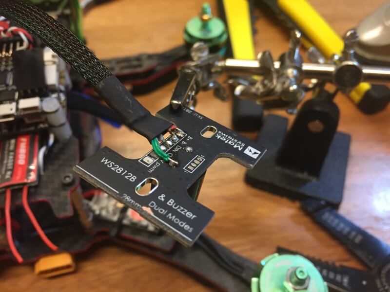 昨日のフライトでLED/ブザーのハーネスが断線し点かなくなってしまったのですが、家に帰って確認してみたら基板側のVCCランドが飛んでました…。新たにハーネスを引き直し、VCCランドは別にもあったのでそちらにはんだ付け。ケーブルはナイロンメッシュで保護し、基板側も1液弾性接着剤で保護。これで多分大丈夫かと(^^;;