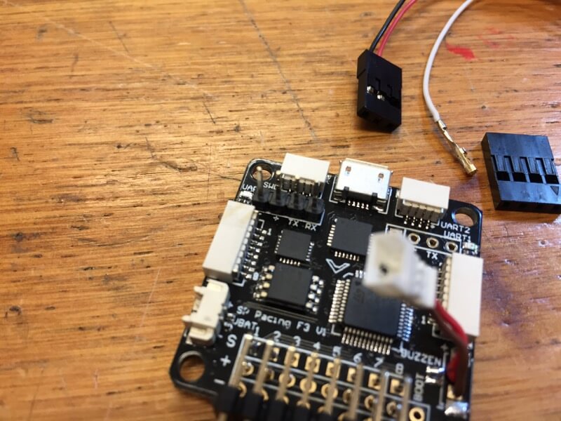 懸案だったレシーバーの配線はUART3にピンヘッダを立てて解決。レシーバーに標準添付の3ピンプラグはそのままだとUART3のTxとつながってしまうので、4ピンプラグに差し替えました。リアにはMatek製のLED/ブザーを配置。一体型なので見た目はスッキリします。Txモードもあり、FCに依存させずに動作させることも可能です。UART3にピンヘッダを立てました。斜めにしないとカウルと干渉します(^^;;
