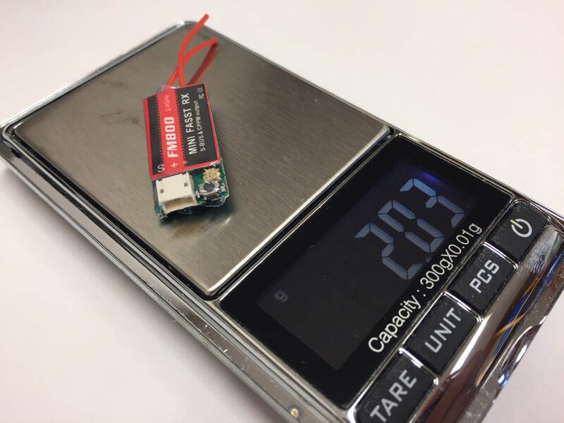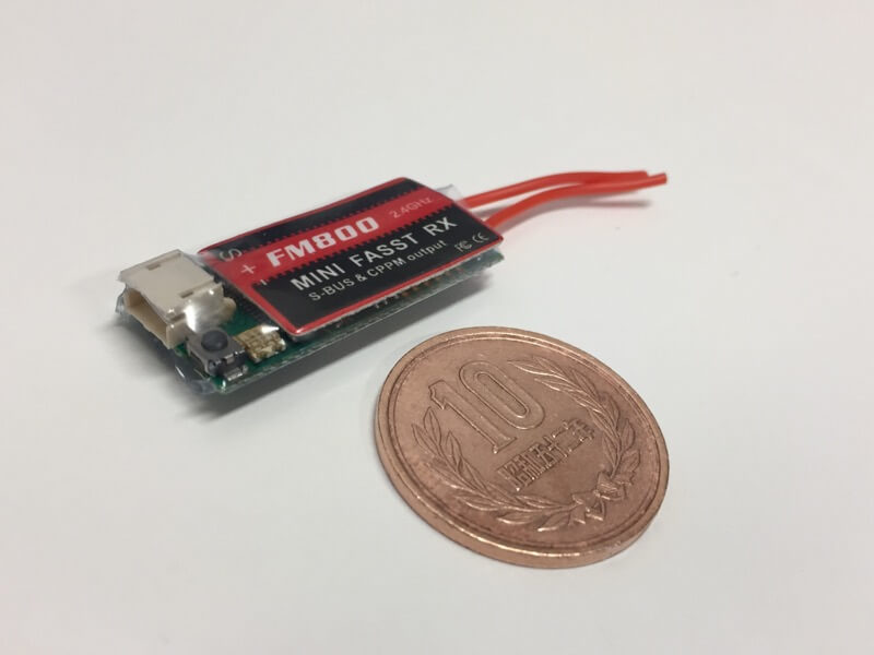 受信機はKS-Servo製のFM800にしました。FAAST互換で出力はS.BUS/PPM専用の受信機ですがなんせ小さい。デコーダー積んだら飛行機なんかにも積めるんでしょうけど、コネクタなどは完全にFC専用のよう。何種類ものケーブルがついているので、さして困ることはないと思います。この小ささ(゚д゚)!