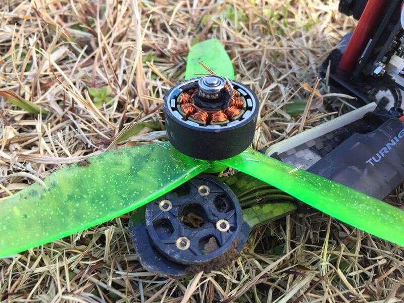 僕のZMRは250で3Sという鈍足仕様なので、舵の練習…にもなりませんがぼつぼつ飛ばしてます。きよっさんとK2さんが帰ってからもバッテリ消費目的で飛ばしていたのですが、最後の最後でちゅど〜ん…ペラはぜんぜん大丈夫だったのに、モーターがばらばらになりました…orz スペアがないので残り3つはゴミ箱へ(笑) 予備機のモーター(ZMRモーター)を引っ張ってくることにします。このクラッシュでも壊れない…BeeRotor恐るべし…
