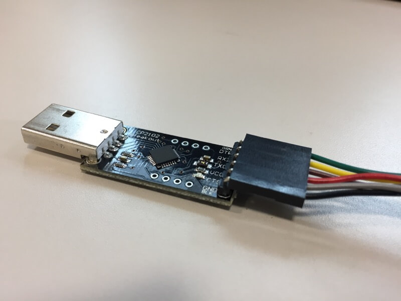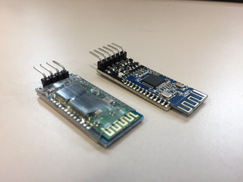 お次はBTモジュールの設定。HC-06とHM-10です。HC-06はBT2.1、HM-10はBT4.0のモジュールです。汎用性が高く、実績も多いのはHC-06ですが、iOSでは認識しないとのことでHM-10も併せて設定。USBシリアル変換モジュールを使います。適切にドライバが設定されていたらUSBシリアル変換モジュールとBTモジュールをつなぐと、ターミナルソフトでATコマンドが通るはずです。どちらも初期ボーレートは9600bpsでした。なお、HM-10は何かの拍子に1200bpsに設定してしまうとロックがかかってしまい、文鎮化するので23ピンをGNDに落としてリセットしてください。USBシリアル変換アダプタとBTモジュール。長いほうがHM-10です。