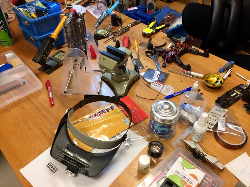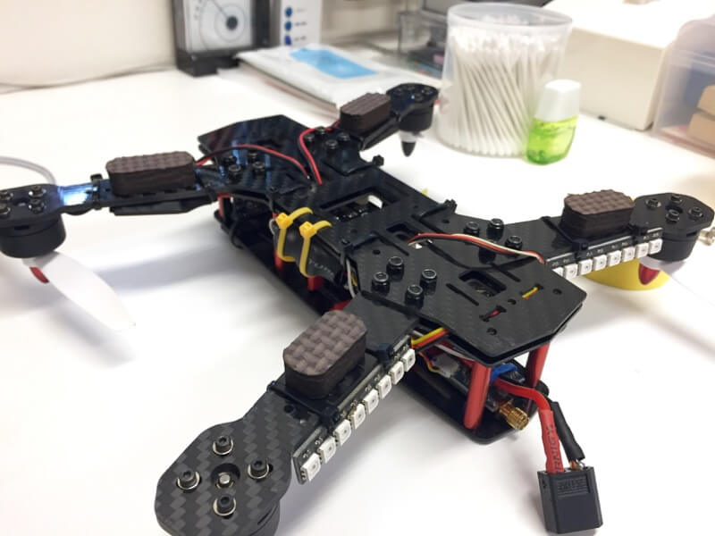 あまりに寒かったり仕事だったりで、なかなか飛行場に赴けないのですがボチボチと重い腰を上げてZMR250を組み直しました。4つあるスキッドのうち一つがどこかへいってしまったので、EVAスポンジで切り出して貼り付けるだけ。ところがESCをアーム裏に配置していたので配線の長さを変える必要があったりして、結局ほぼ全バラにしてはんだ付けし直しのハメに。ちぎれてしまっていたLPFを付けなおしたり、LED用にBECを新規で取り付けたりと見た目はほとんど変わらないのですが結構時間がかかりました。おまけにFC設定中にオールリセットをかけてしまい、これも一から設定し直し…。とりあえずホバリングできるまでにはなりました(^^;;