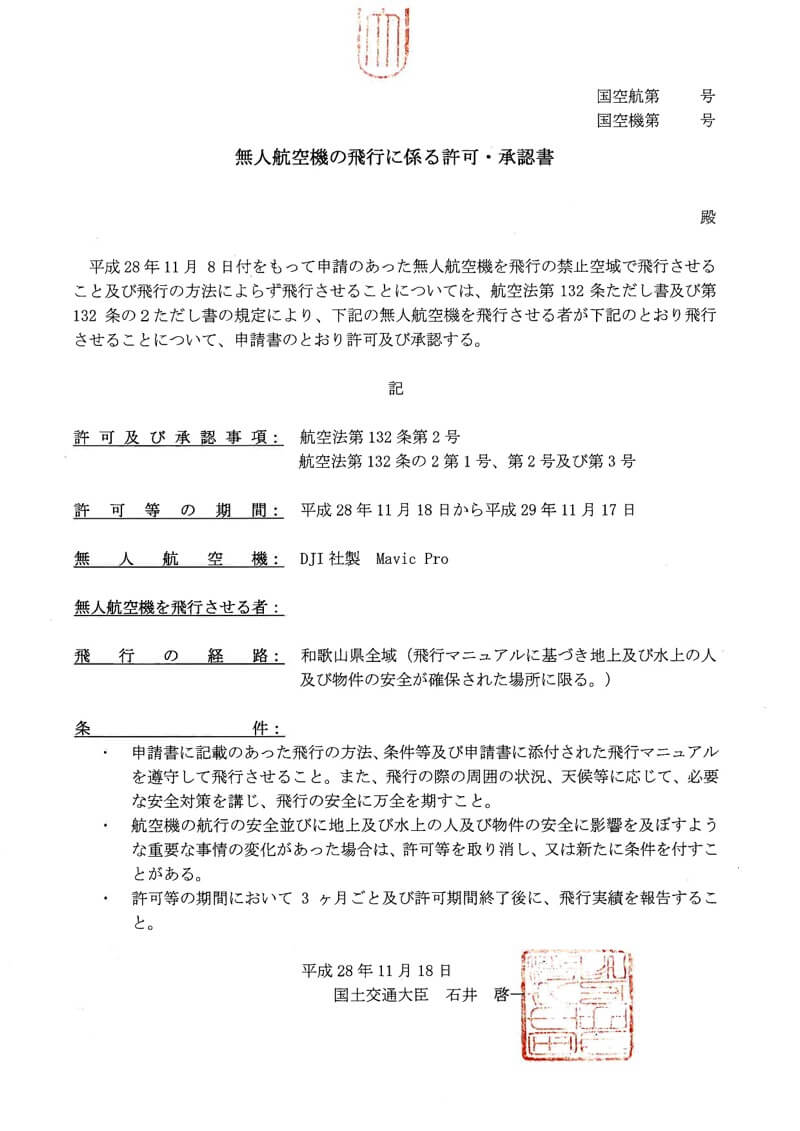 フライトが無許可でも認められる要件にはいくつかあるのですが、【DID以外】【目視】【日中】【対人対物30m以上】【対地高度150m以下】が主なものとなります。もちろん離陸重量200g以下の無人機はこの法律の適用外ですので、いつでもどこでも飛ばしていいです(ただし、重要施設付近では飛ばせません。改正航空法以外に【小型無人機等飛行禁止法】の縛りを受けます)。許可証はこんな感じ。運行安全課・航空機安全課の2課に登録されるようです。