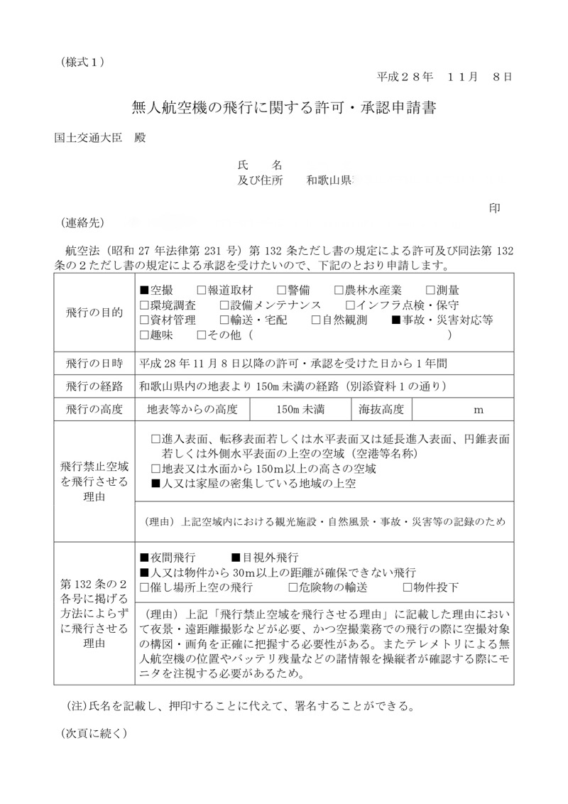 まぁ、何にせよ狭くなってしまったお空。ちょっとくらいなら見逃してほしいものですが世間様はそうはいかないようで、下手すると110番通報されちゃいます。そこで(仕方なく)国土交通省の許可を頂くことにしました(^^;;申請書は規定通り様式1〜3および添付資料を揃えます。Phantomなんかだと機体の詳細を省略することが可能なのですが、MavicProはまだ実績がないためか機体の詳細を記載せねばなりません。スペックシートを添付し、その他いろんな資料を添付して申請。メールで送るか、紙に印刷して送るか、色んな方法がありますが一発で通ることはないと思うので、メール申請が無難だと思います。送信後10日くらいで無人航空機審査グループ(A~Cまであるようです)の担当者から連絡があり、修正点を指摘されるので、指示に従って修正し申請すれば許可が降りると思います。なお、飛行マニュアルは国土交通省の様式そのままを使うのがベストです。かなり早く審査してくれます(^^;;
