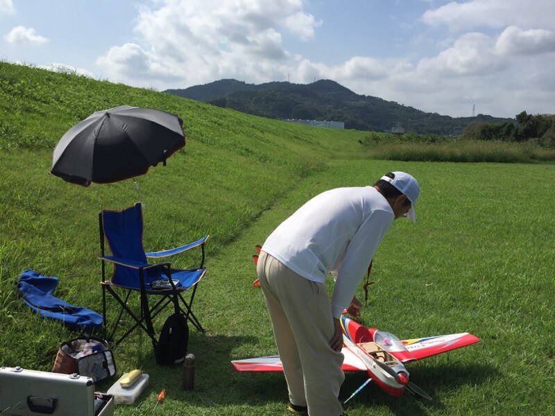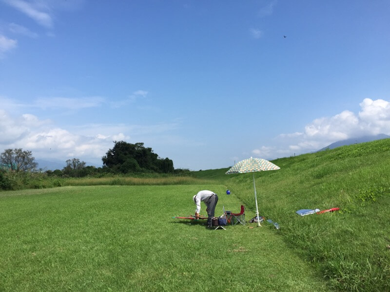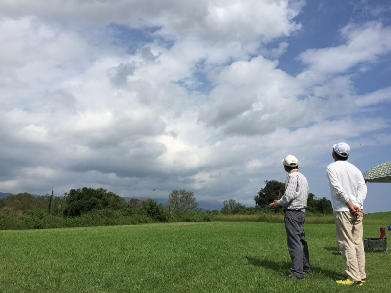 土曜日は仕事も早めに終わり、昼過ぎから飛行場へ。まずまずのお天気で飛行機組の皆さんは大会に向けて特訓中。適当に飛ばして遊んでました(^^;;