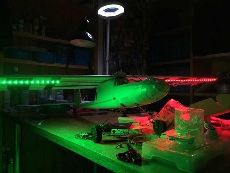 さて、週が明け台風が接近。Bix3の視認性をあげるべく主翼前縁にLEDを仕込んでみました。真っ昼間はともかく台風前の曇り空なら大丈夫だろうと飛ばしてみましたが、全然見えません(^^;; 風も強いし1Fでそそくさと撤収。LED追加を検討します…。晴天ならともかく曇り空でも見えません…orz