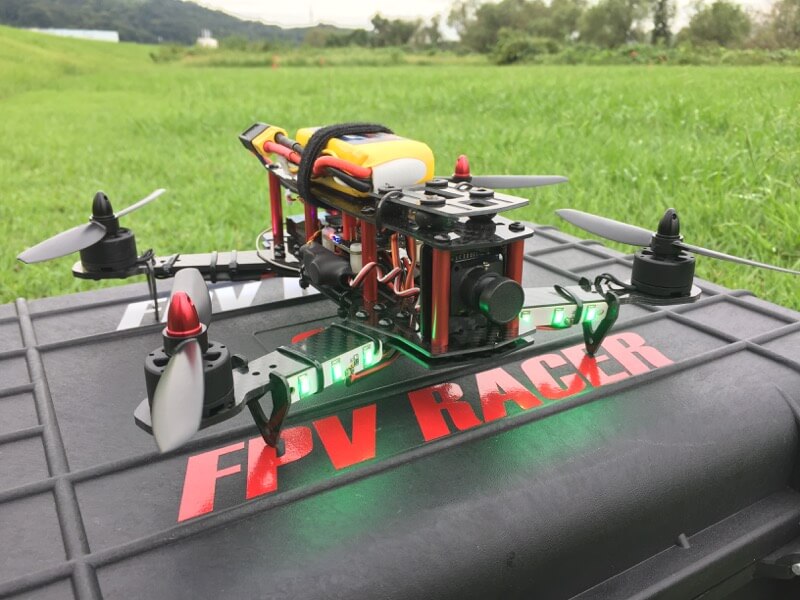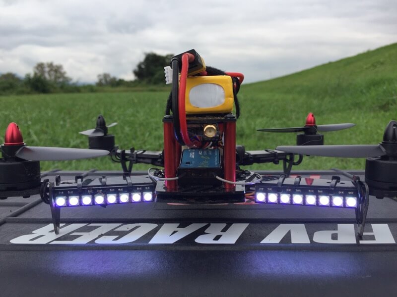 途中、姿勢を見失って墜落しましたが無傷で問題なく回収できました。ちょっと濡れましたが、そのまま飛ばして水滴を飛ばしておきました(笑) やはり250はLOS(Line of Sight、目視のことです)で飛ばすのは難しく、LOSなら高輝度LEDは必須のように思いました。50mも離れると前後関係がさっぱりわかりません(^^;;これは後ろ姿。このLED、かなり不安定なのでコンタクト見直しの予定。