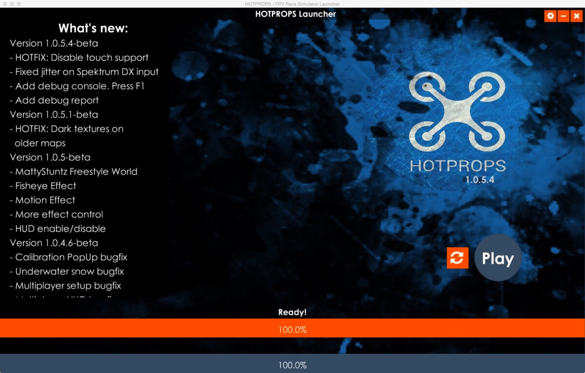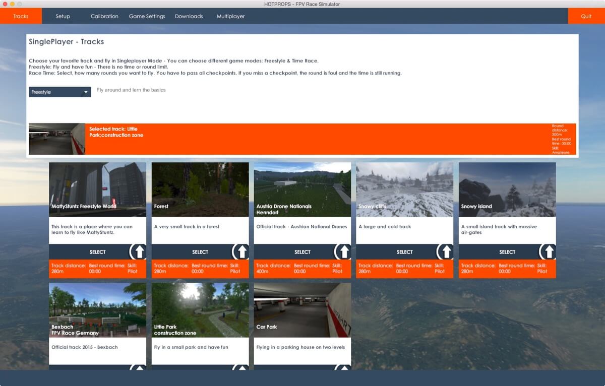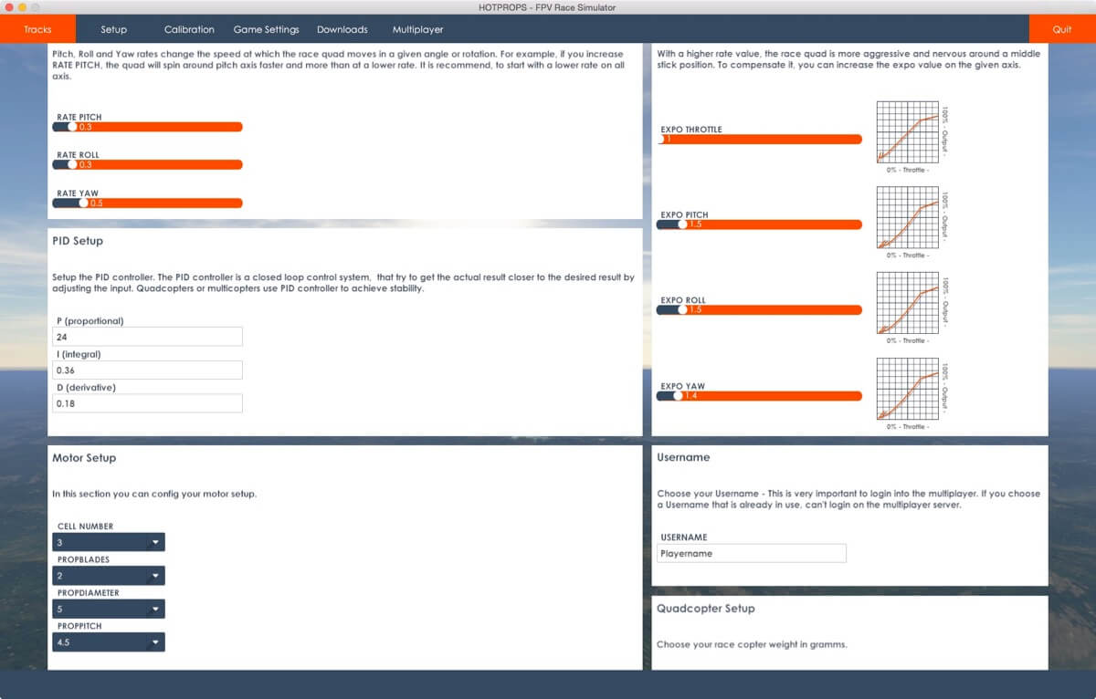 HOTPROPSは機能制限のない無料のシミュレータですが、設定項目も多くFPVカメラを模したノイズの入り方などかなり凝っています。また、マルチプレーヤーに対応しているのがミソで特筆すべき点と思います。ただ、設定はやや複雑で最初はとっつきにくいですね。