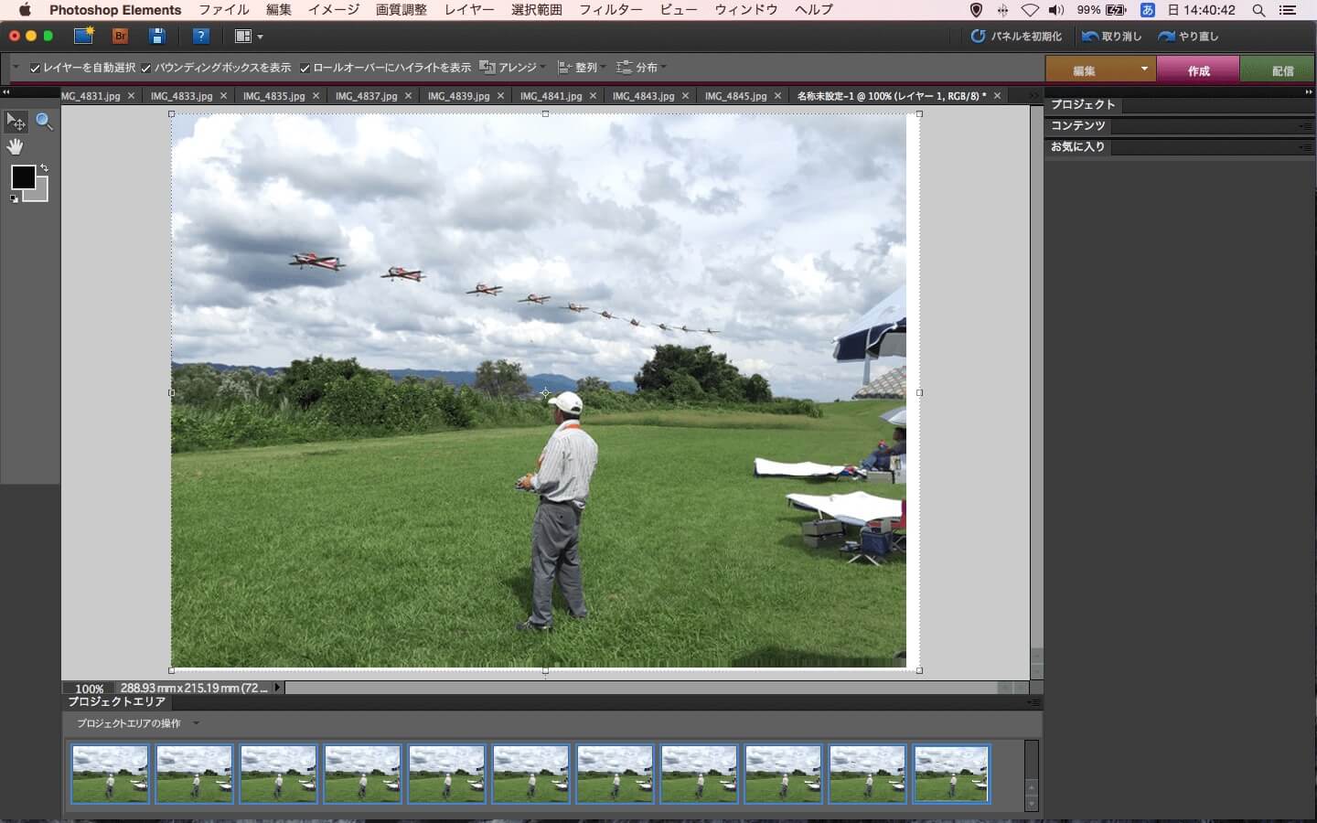 最近、K2さんがスローモーを撮りだしたらしいのですが、撮影に使ったiPadだと120fpsまでのよう。僕のmini2ではスローモー撮影すらできないので、ハードウェアに依存するようですね。さいごにきよっさんのローパス(着陸やり直し?)時の連写を合成。モーションショットというアプリでもお手軽にできますが、今回はPhotoshopElements8でやってみました。iPhoneで連写した写真を取り込み(最大10枚までなので、それ以上の場合は10枚ごとに仕切り直すようです)Photomerge Groupshotメニューで編集するだけ。最終イメージを用意し、それに乗せていく感じで差分部分を選択するだけ。半自動なので細かな選択は必要ないです。半自動とはいっても結構面倒です。ただし品質は上々(^^♪