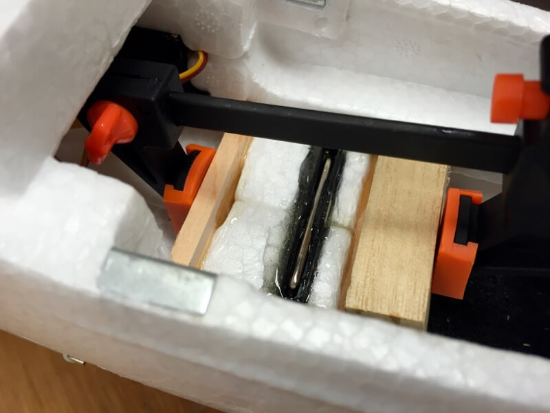さて、日頃はこのランディングギアで飛ばしているのですが気になる点がいくつかあります。まずは脚の取り付け部。プラスチック製のホルダを機体側に刺し込み接着するのですが、着陸時の抵抗からか取り付け部そのものがぐらついてきます。こうなるともはやランディングギアとしての役目を果たせず離陸も困難になります。いままでは壊れるたびにエポキシを流し込み、その都度補修してきましたが今回は檜板を前後に貼り合わせるように接着。これでダメならかんざしするしかないようです…(^^;;
