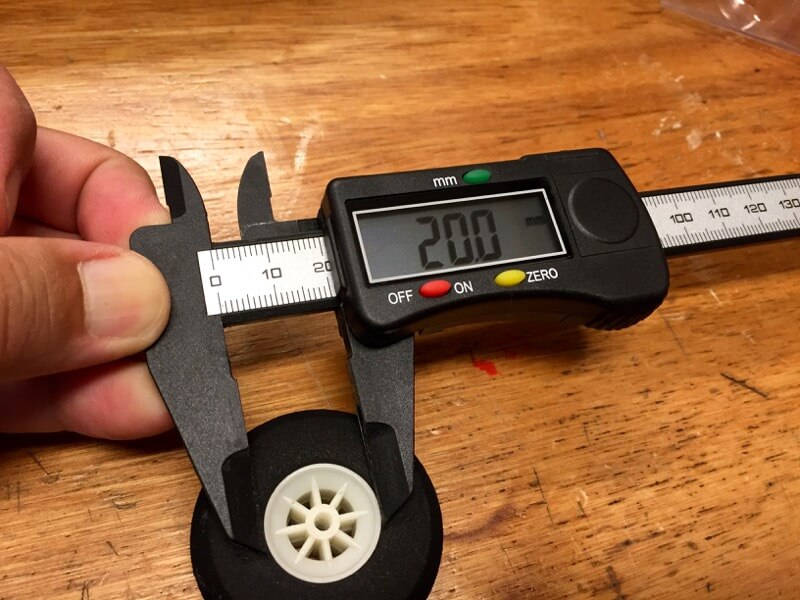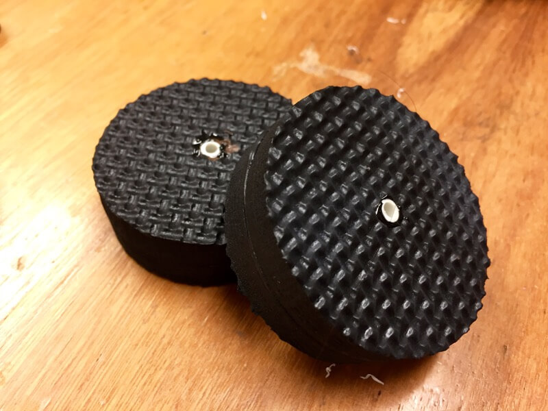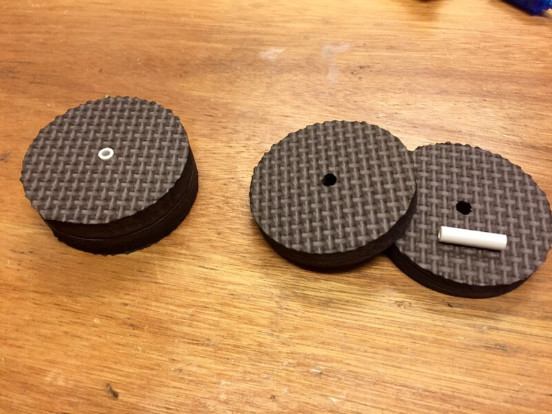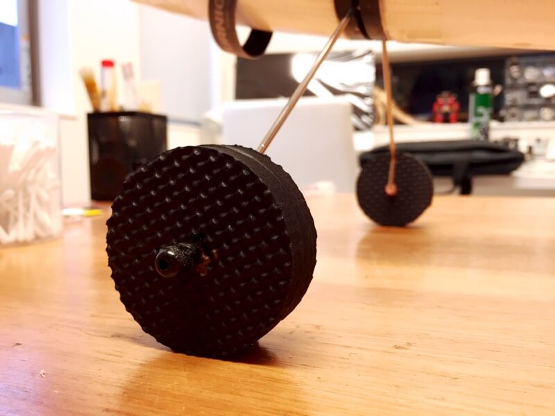 車輪材料ですが、当初はゴム板を積層して作ろうかと思っていました。ただ、密度が高くなると重くなるし積層作業も面倒なので100均で売っているようなEVAマットをレザーカッターで切り出しました。標準車輪径は約45mm、t=17mm、ホイール径が20mm、軸径が3.5mmでしたので、車輪径を60mm、ホイール部分は5mm径のプラスチックパイプの内径を3.5mmに拡大して通すようにしました。EVAマットはt=10mmでしたので2枚重ねてt=20mmとしました。切り出して、色塗って、軸を刺し込み固定して終了(^^♪ちゃんと飛行場から離陸できるかな?(^^;;