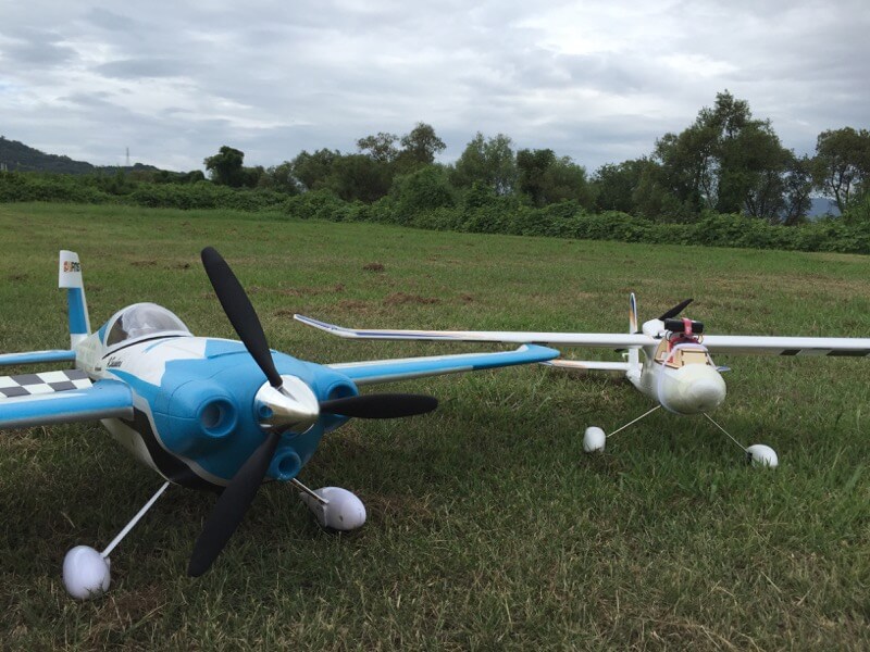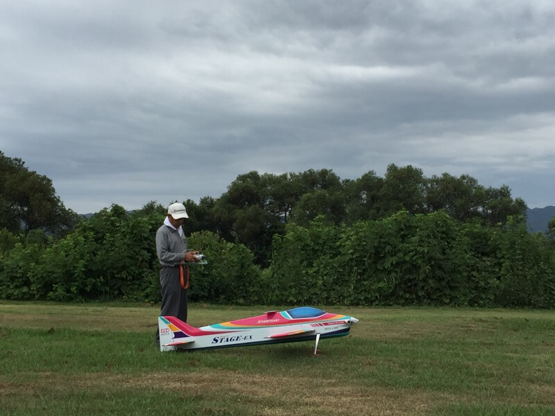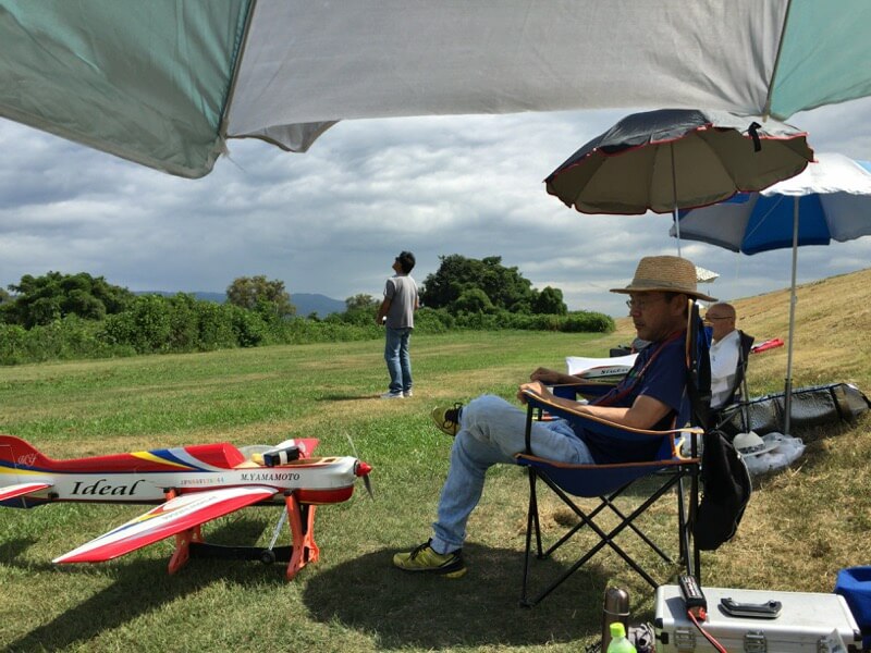 飛行場到着時は曇り空で風もあり結構涼しく感じられましたがまもなく快晴モードに。モーター軸も換装したEdge540から飛ばし始めましたが、東からの風のため西側から離発着することに。時々風がやみ着陸させようとタイミングを伺いますが、なかなか難しく、とりあえずいつものように前のめりでなんとか着陸。日頃から練習しておかないといけないようですね。お約束(笑)