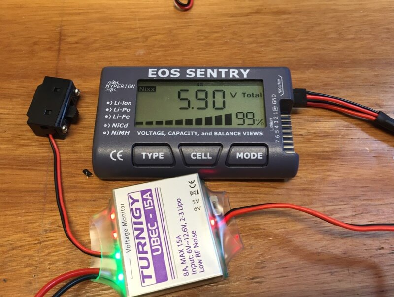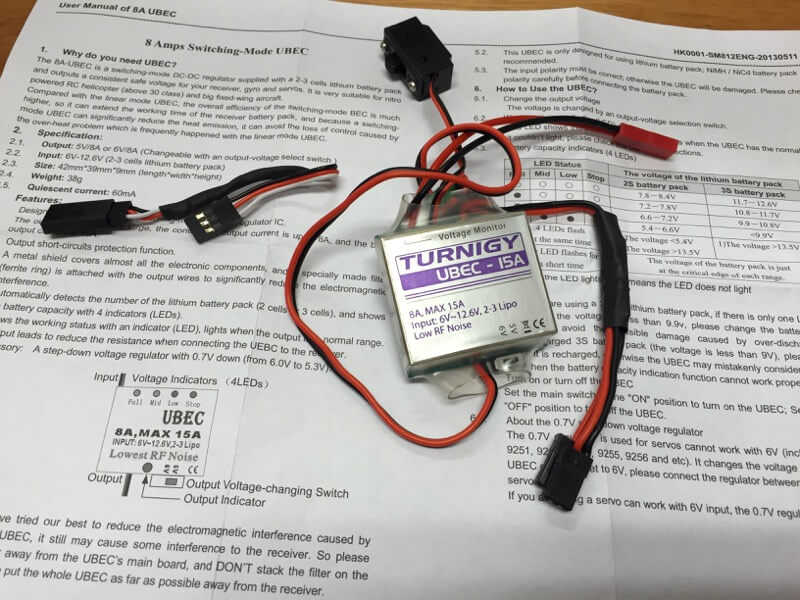 で、今回は以前に買ってあったTURNIGYの8A-15Aタイプに変更することにしました。こいつは5V/6V切り替えができるスイッチングタイプのBECです。取説には