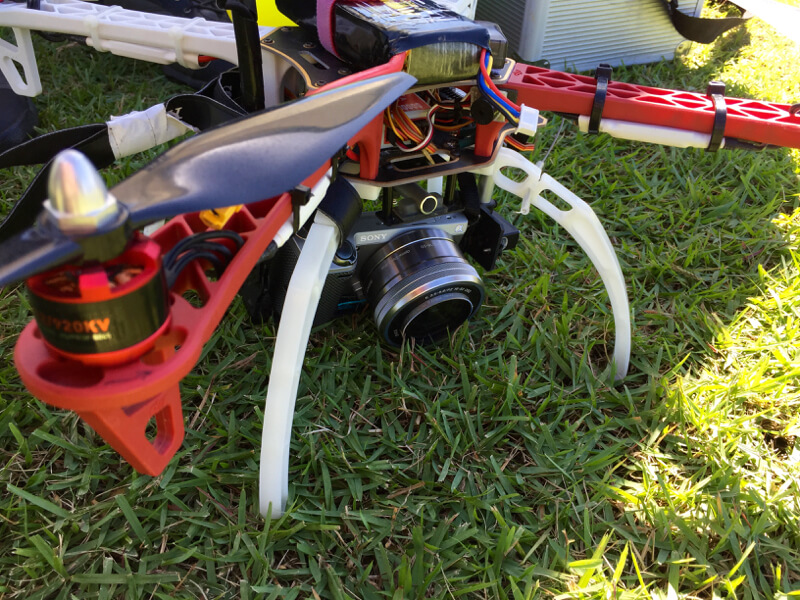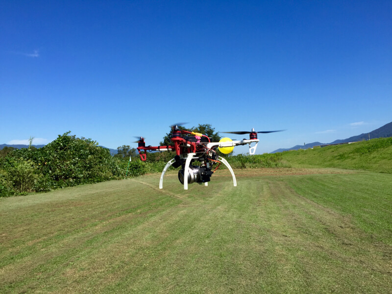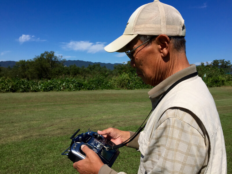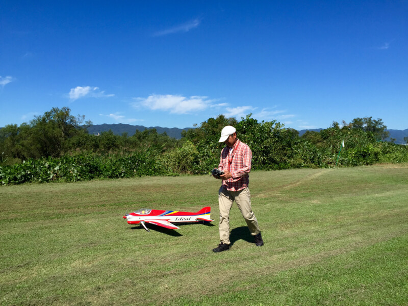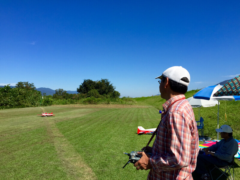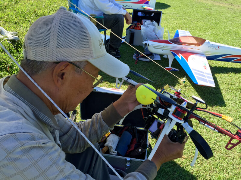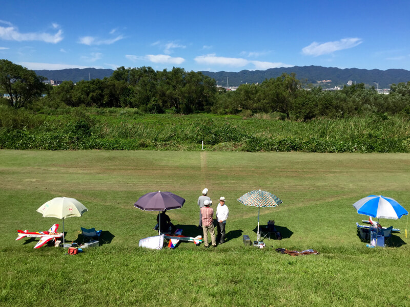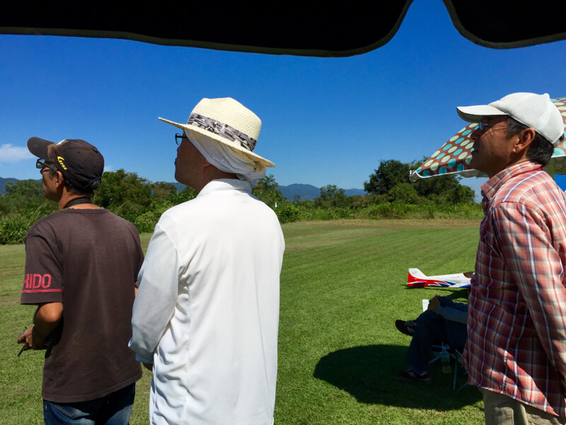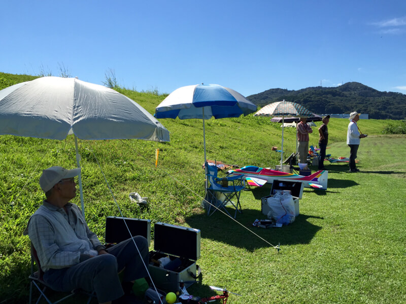 来週の大会に向けて飛行機組は朝から練習だった模様。快晴の中、飛ばす機体がないので偵察だけ(笑) 草刈りしていただいたようで、滑走路には60°の草刈りラインが出現(^^;; hatayanさんは450クアッドにソニーのミラーレス積んで空撮されてました。