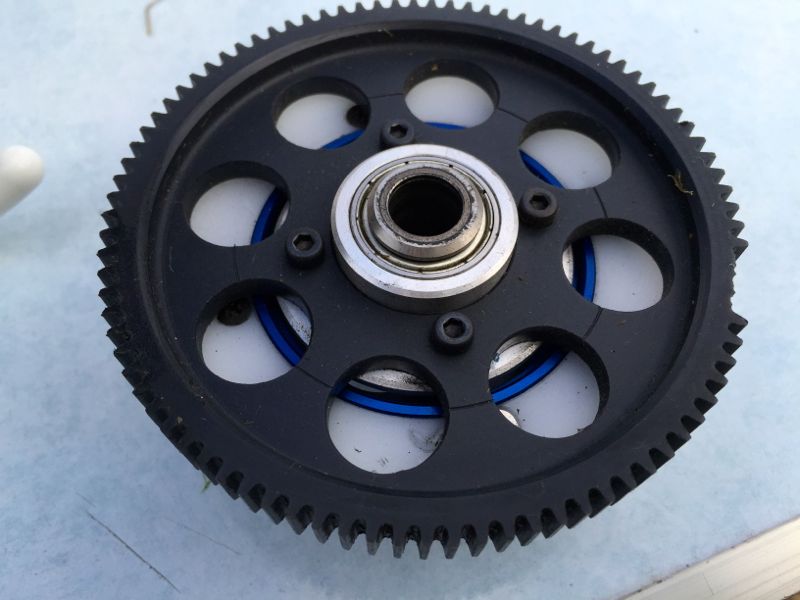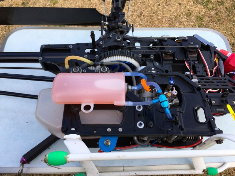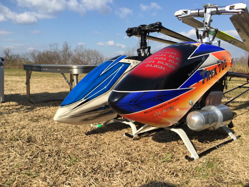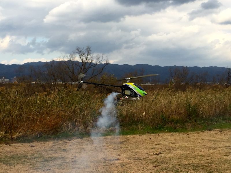 700Nはエンジン絶好調。15%ニトロなので大したパワーは出ないはずなんですが、気温とニードルがマッチしてるんでしょう、ホバリング時からいい感じに。で、いつもの様にカッ!とスロットルを煽って上空へ。ターンしながら帰ってくる途中でギャ〜(ノ゚ο゚)ノ…とギヤが飛び、オートロで無事回収。オートロ覚えておいて良かったです(笑) 予備ギヤがあったはずなので交換と相成ります(^^;;