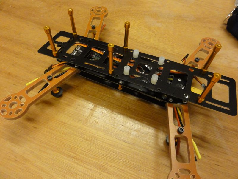 …で、凝りもせず新しい250クラスクアッドを作成中。PCBフレームでアームなどはなかなかの質感ですが、プレートは薄いなぁ…。今回は使い慣れたKK2をやめ、Naze32を搭載する予定。慣れてきたらCC3Dもいいなぁ(^^)/
