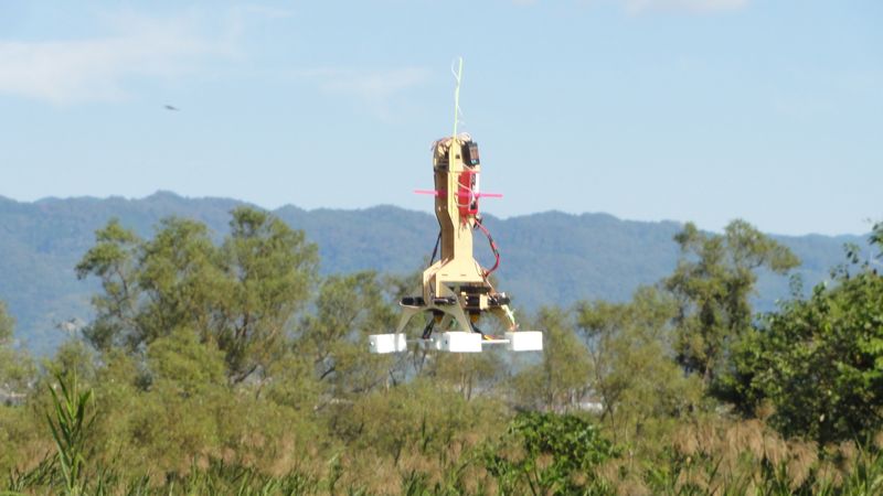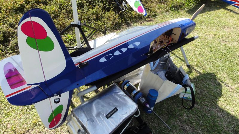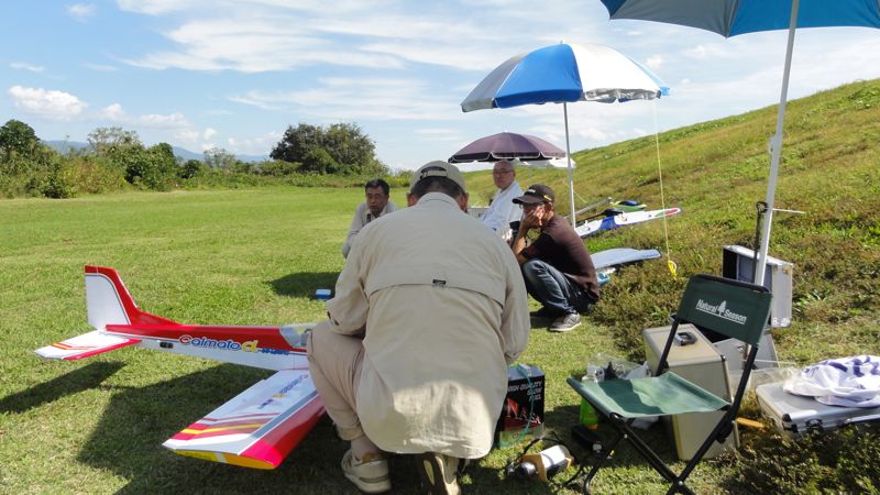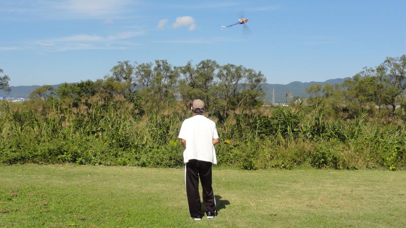飛行場はとっても良いお天気で、飛行機やヘリも飛んでいましたが、変わり種も登場。以前、この飛行場でよく飛ばされていたM先生です。T大学で教鞭をとっておられますが、研究室で作られたダクテッドファンを2台積んだ謎のロケットっぽい飛行物体を飛ばされました。推力偏向方式で、ファンはそれぞれ2つのサーボでXY軸を制御されています。近未来的でよくわかりませんが、すごそうです(笑)