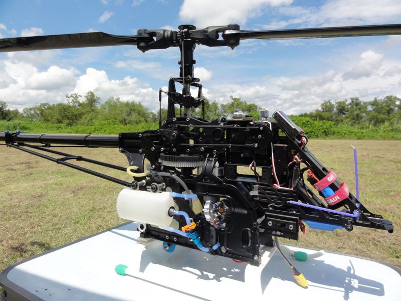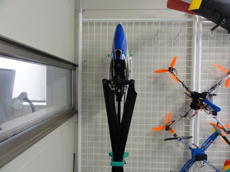 そのまま下流へ流れていったものの、一旦手前の岸近辺で漂流。なかなか回収できず、弐号機に紐を括りつけて飛行機奥でリリースする作戦を決行…したまでは良かったんですが途中で紐の長さが足りなくなったためか機体は姿勢を崩しローターに紐が絡まりあえなく水没。ヘリは浮かんでくるわけ…ないですよね(^^;; 回収しようにも回収できず、ここで水難事故なんて起こした日にゃ二度とフライトできなさそうなので、2009年以来5年近く頑張ってきた弐号機は抹消処分としました。もったいないですが、人命には代えられません(^^;;今朝のハンガー。相棒はもう…Ω\ζ°)チーン