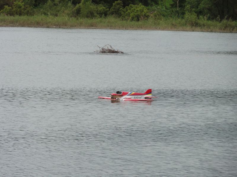 時々雨が降ってはくるもののにわか雨以下のレベル。そんな中、I店主の飛行機が上空で突如ノーコンに。エルロンが逝ってしまったようで、そのまま墜落。どうも川面に落ちたらしくしばらくすると茂みの間から飛行機がゆっくり流れているのが確認できました。どんぶらこ〜どんぶらこ〜♪ モーターは墜落時にもげてしまっているようでした(^^;;