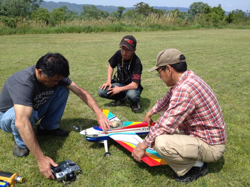 STREAMは以前のNiMHがほぼご臨終でしたので、電源を2S LiPoに交換。早速飛ばしてみるとラダーが逆。ジャイロを外してそのままにしていたのが影響したみたいです。その後はスローでエンストし不時着すること2回。T口さんとおいやんの大活躍でスローニードル・メインニードルの調整が無事終了しその後は快調! おしまいにFX22でデータを作り直して終了。今後はFX22で飛ばすことになりました(^^)/