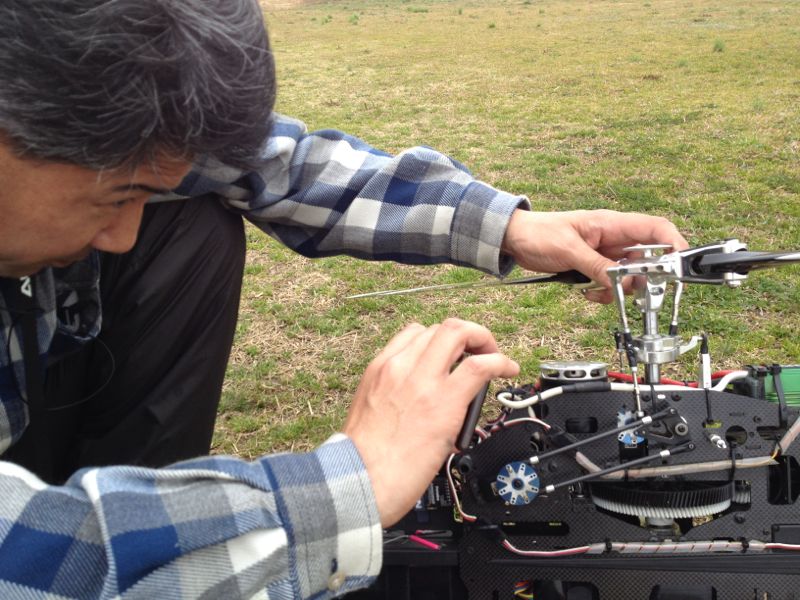 僕はB2を1F、初号機を3F。B2は曇り空だとやっぱり見難くて、いまいち面白くありません。徐々に飛ばしこんだら慣れるかな?初号機はいつものように飛ばしました。雨降り前の無風なので風の影響がなく飛ばしやすかったです。先日から気になっていた唸るような異音ですが、ピルエットさせるとどうもテールローター回転面に正対した時に音が大きくなる感じ。試しにテールローターを予備のカーボンローターに変えたら音がしなくなりました。しばらく様子見です(^^;;最後にDsicoProとJYALAさんのHubsanでまったりランデヴー(笑) お天気の良い週末はいつになりますかねぇ…。