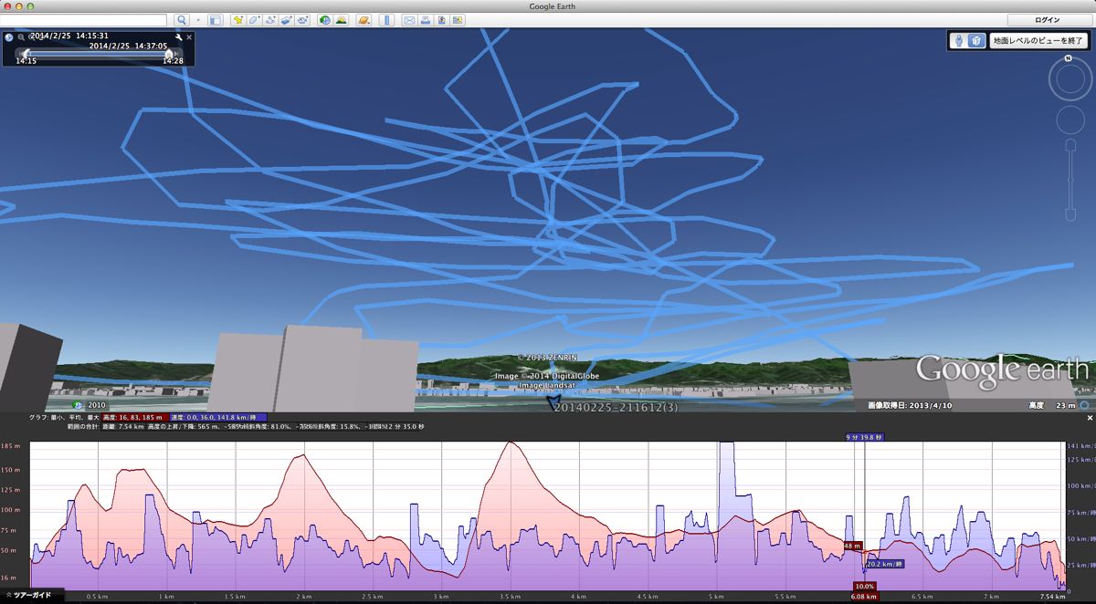 GoogleEarthに投影。画角のせいでかなり広範囲を飛んでいるように見えます(^^;;