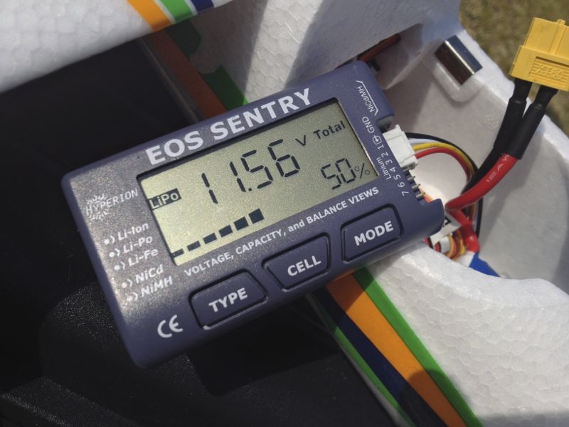 バッテリは3S/2200mAhで飛ばしましたが、30-50%程度のスロットルを入れ続けて15分弱程度のフライト後50%程度。スロットルをオフにできれば20-30分は十分遊べそうです。だらだらモーターを回して15分弱、これくらい残ってました。