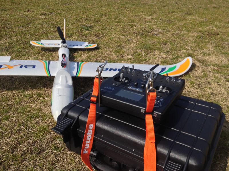 フルスロットルで【エイヤッ!】と投げると、ふわりと飛んでいきます。しかし風が強くまるで凧のよう。風見鶏のように機首が風上を向こうとするので操縦は大変です(^^;; トリムズレなんかもあるのかないのかわからない状態(笑) また、今回はカメラも積まず、素の状態で飛ばしたのでややオーバーパワー気味でした。軽いので風に煽られるものの、フルハイだとガンガン突き進んでいきます(^^)/ GoProなんかを積めばもう少しマシになるかも(^^;;それでもなんとか無事にロールアウト完了。フラップの効きが良すぎるのでエンドポイントで若干修正しました。12ZHならAFRで設定できるのに、FX22だと基本舵以外はできません。これは残念…orz