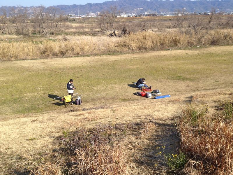 今度こそは、ということでスロットルを開いていくと…全開近くで突然ESCのカットが入ってしまいます。最初はバッテリなんかも疑ったのですが、満充電に近いものを使っても結果は一緒。送信機設定もエンドポイント・サーボ信号共に問題なし。いくらやってもダメっぽかったのでESC(HobbyKing 30A 3A UBEC)の不具合か、ということで撤退。メカは基本的にバラしたB2からの移植なので放置中に壊れたのか?と思いました。家に帰ってやってみても同じ。とりあえずESCのマニュアルを見ながらファクトリーデフォルトにしたところあっさり解決(^^)/ 全開でもペラは止まらずいい感じになりました。これなら飛ばせそう(^^)/今日はそこそこ賑わっていたようです(^^;;